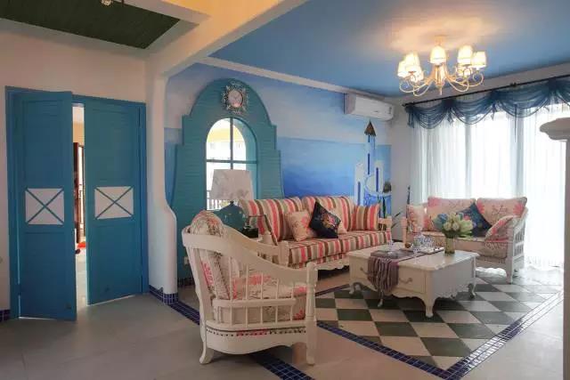 以馬賽克裝飾會客區的地面,除了沙發背景墻元素有點多,白色紗簾藍色簾頭倒是很出彩。