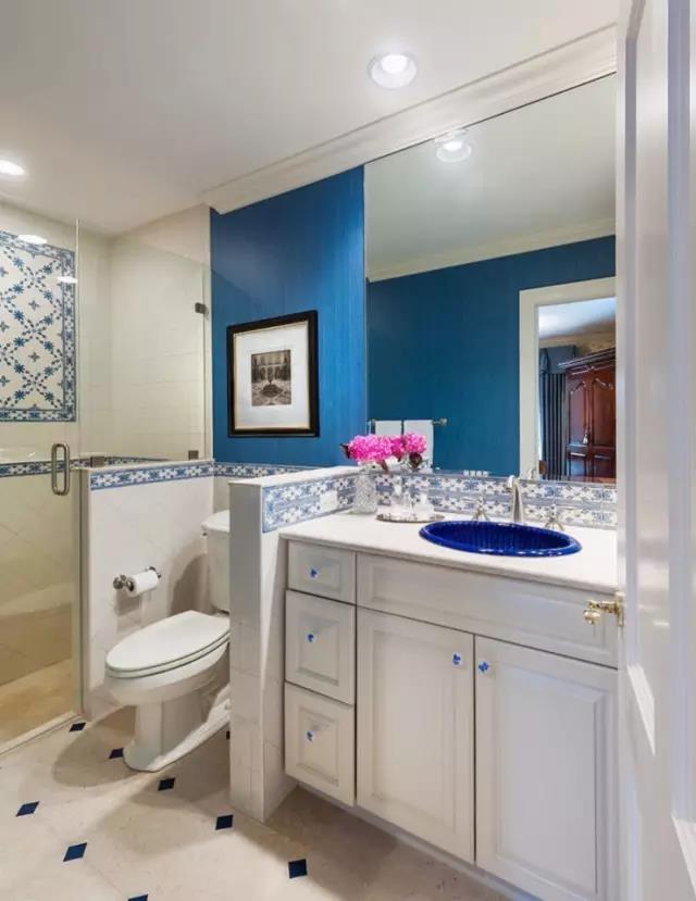 狹長型的衛生間,或半墻或半墻加玻璃的方式進行隔斷,藍色的局部背景墻讓空間不再那么“禁欲”。