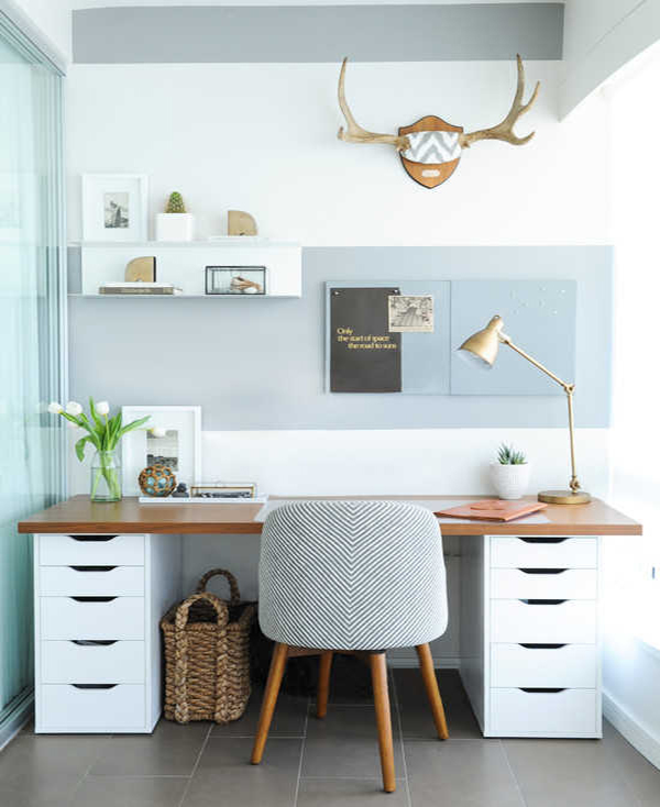 現代簡約風工作臺:在窗臺邊辟一處空間,或者在臥室的一角安置一套桌椅也能打造舒適的工作空間,置物架的應用可以增加很多收納空間,也令整個空間更具文藝氣息,如果空間夠大,可以打造適合兩人的工作臺。