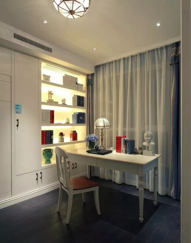 飄窗簾與純白色的家具搭配,顯得書房有某種神秘的安靜,進到書房整個人會變得莫名其妙的心靜下來吧