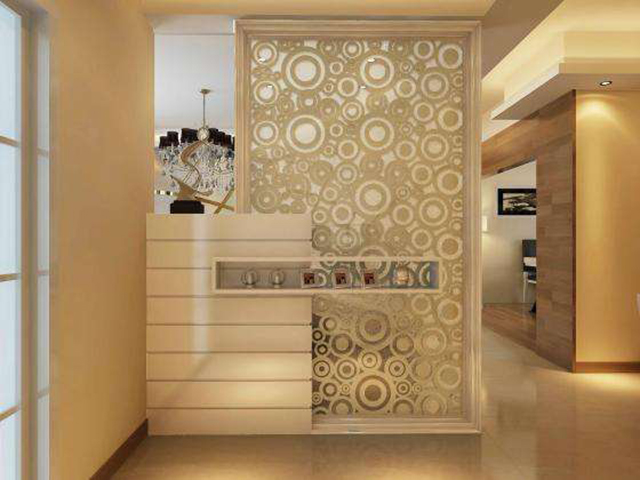 是以大屏玻璃作裝飾遮隔,或在夾板貼面旁嵌飾噴砂玻璃、壓花玻璃等通透的材料,既可以分隔大空間,又能保持整體空間的完整性。