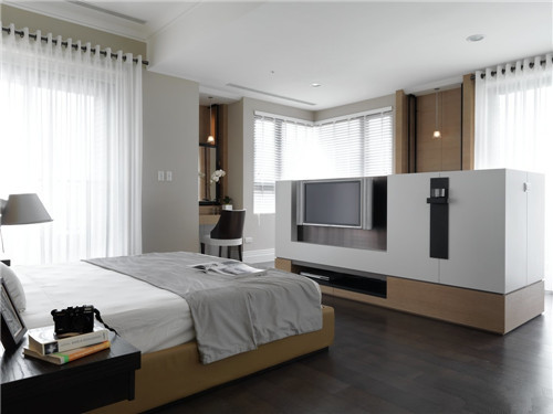 臥室、洗手間一柜分離:在打造主臥過程中,如何能更大利用空間?比起裝一道門來分隔衣帽間和臥室,用兩扇柜子門是不是更簡單?現在是打開的,合上就會變成一道門。