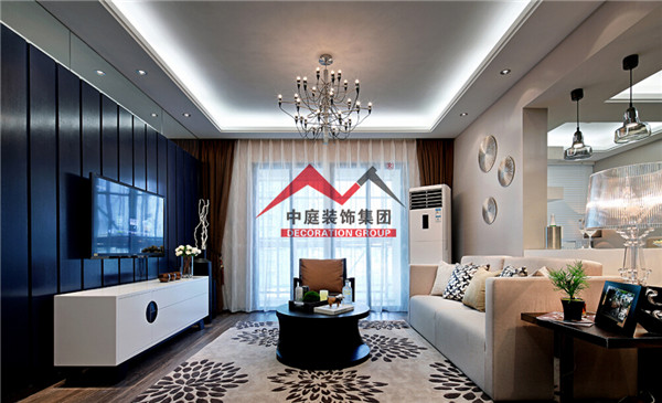 客廳主要運用灰調做主調,深藍色的電視背景墻凸顯出區域感,讓整個空間充滿神秘又不失格調的優雅。