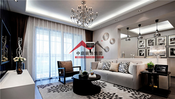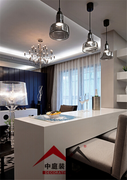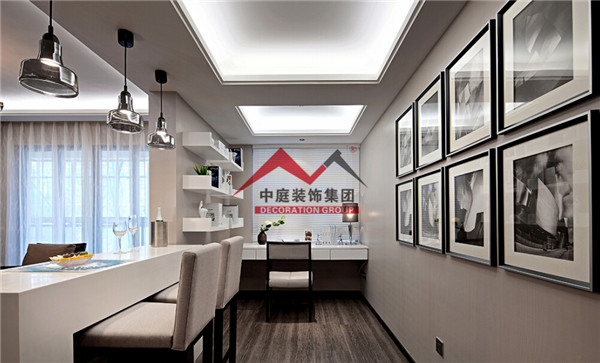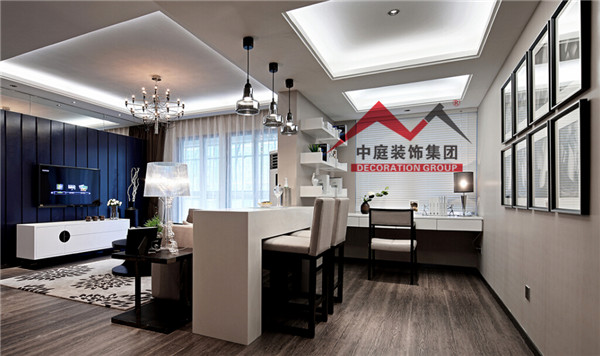 中間用一個吧臺把客廳和書房隔開,即實現了一個大客廳的視覺空間效果,又增加了客廳的裝飾生活情趣。