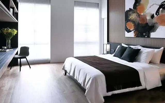 ▲床頭背景墻也被設計成木質的,搭配衣服黑白的水墨畫后,別有一番意境。