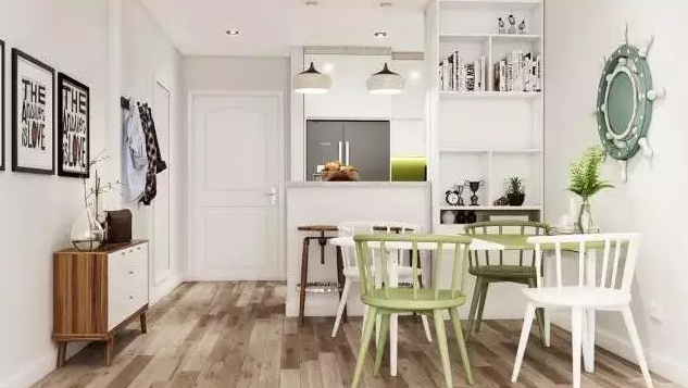 開放式的餐廳內選擇一些綠色餐椅呼應了整個主題,墻上的裝飾增加了趣味性。