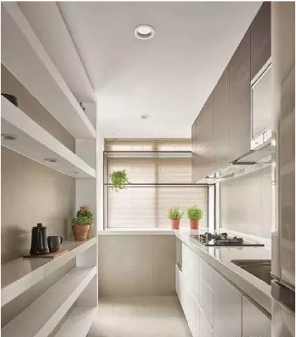 ▲在家也能有餐具展示墻:捨棄封閉柜體,利用大面積開放層架收納兼展示餐瓷,更特別在中間層架裝設投射燈,運用光線襯托餐瓷的氣勢并營造視覺焦點;善用窗臺空間收納小型家電:利用廚房末端的窗臺空間收納電鍋、烤箱等小家電,可避免壓縮到狹長型廚房的走道空間,透光佳的玻璃鐵架則保留窗臺原有的採光與通透性。