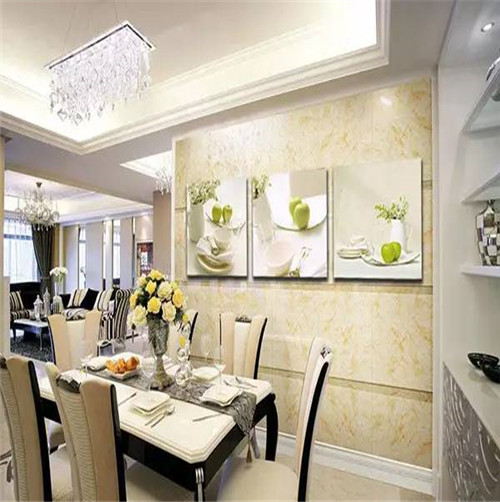 餐廳是進餐場所,餐廳應營造出一種能夠增進食欲、熱情好客的畫面氛圍,給人新鮮清爽的就餐感覺。因此可以選擇一些果蔬、插花、靜物、自然風光等題材的掛畫;如有吧臺,可掛一些對應酒杯洋酒的現代油畫。