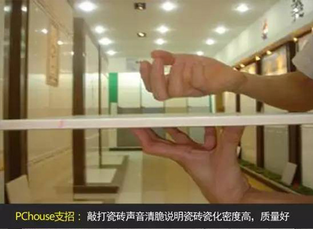 敲打瓷磚,聽聲辨密度。選擇瓷磚最重要的是考慮質量問題,辨別瓷磚好壞有很多標準,可以進行敲打,聲音清脆說明瓷磚瓷化密度高,質量好。