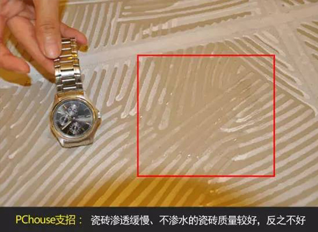 看瓷磚吸水率。一般來說,瓷磚的吸水率低,代表瓷磚的內在穩定性越高,也就越適合濕氣或水分含量較高的空間,如衛生間、廚房等,且不會產生黑斑等問題。檢驗瓷磚吸水率的常用方法是將瓷磚的背面倒水,滲透緩慢甚至不滲水的瓷磚質量較好,反之則為不好。