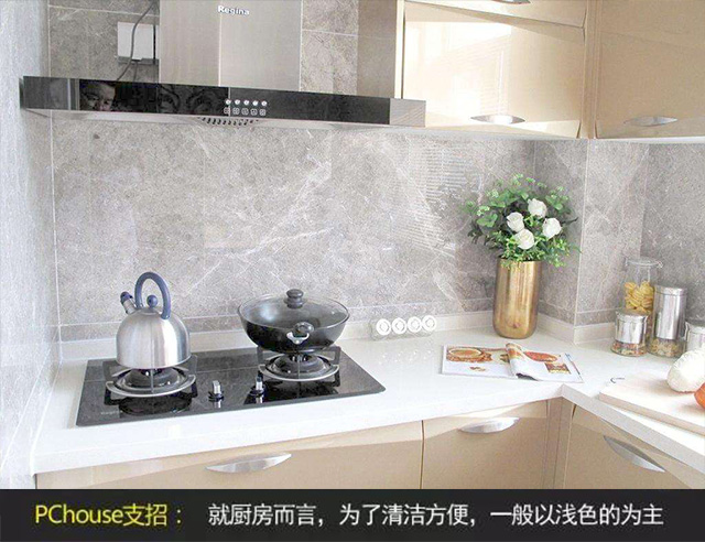 比如廚房一般來說,為了清潔方便,一般以淺色的為主,最常見的白色的瓷磚。