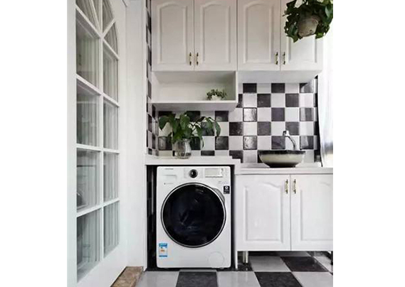 可以選擇把陽臺改成洗衣區,上面有吊頂。是最省錢的,上面還可以儲物,放東西。還有洗手盤,平時可以洗點衣服這樣。