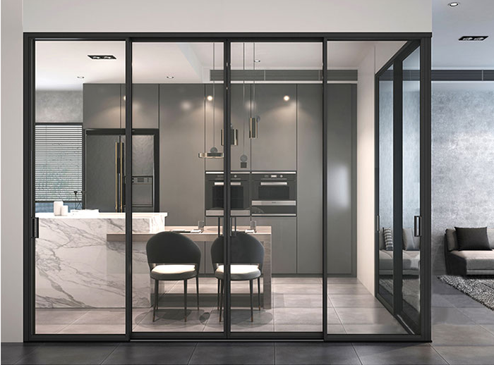 對隔音有要求,而且密封性要好,以防油煙溢出,還要兼顧美觀,可以選用重量輕的鋁合金推拉門,隔音隔熱,而且易清潔。
