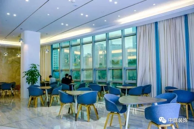 工作區與大廳的富麗堂皇迥然不同,藍色座椅十分清新!