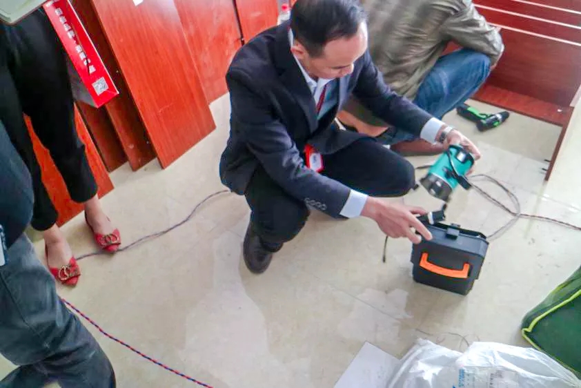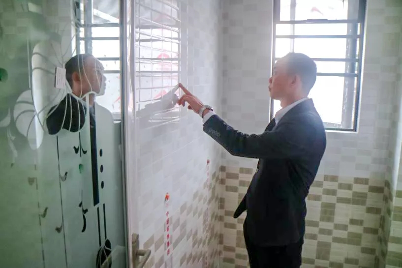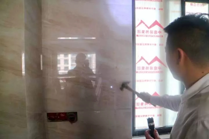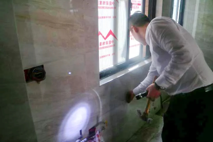 丁總細心的檢驗鋪磚工藝,親自砸掉沒有按標準施工的瓷磚,責令整改。