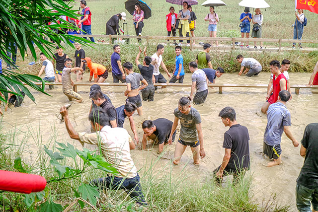 在進行捉雞撿蛋比賽時,先進行一個力量大比拼來先熱身,預防拉傷。