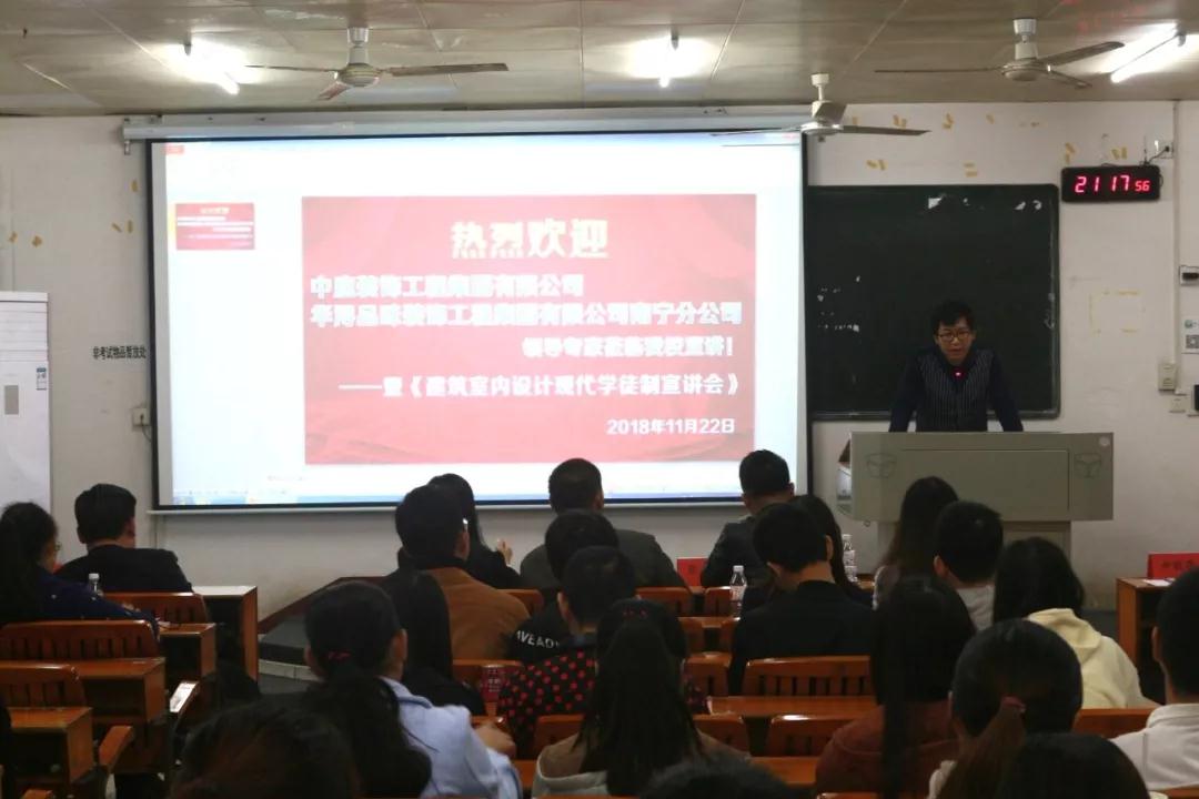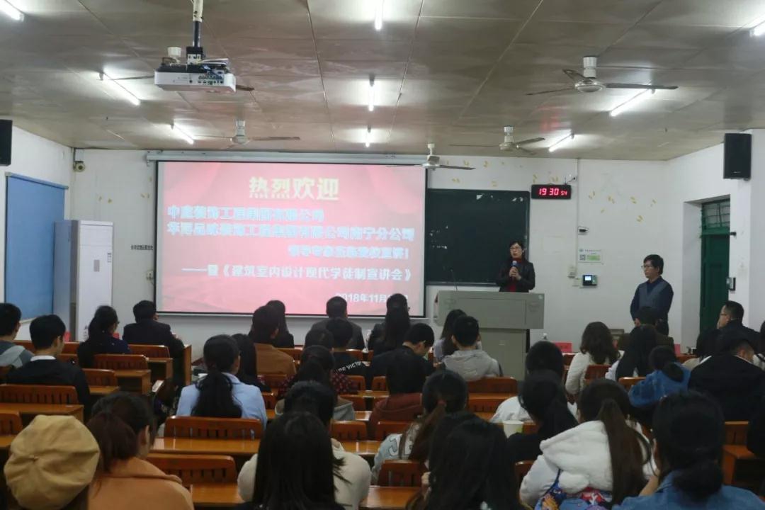 在前期的籌備活動中,已邀請過廣西農業職業技術學院老師和學生來中庭裝飾集團進行過參觀與交流,彼此都留下非常好的印象,2018年11月22日,我公司張立安張總帶領營銷三部蘇家毅蘇經理和人力資源部黃紅娟黃主管等人去到學院進行宣講,讓老師和學生們更加了解中庭裝飾集團,讓他們明白,選擇我們,是正確的。