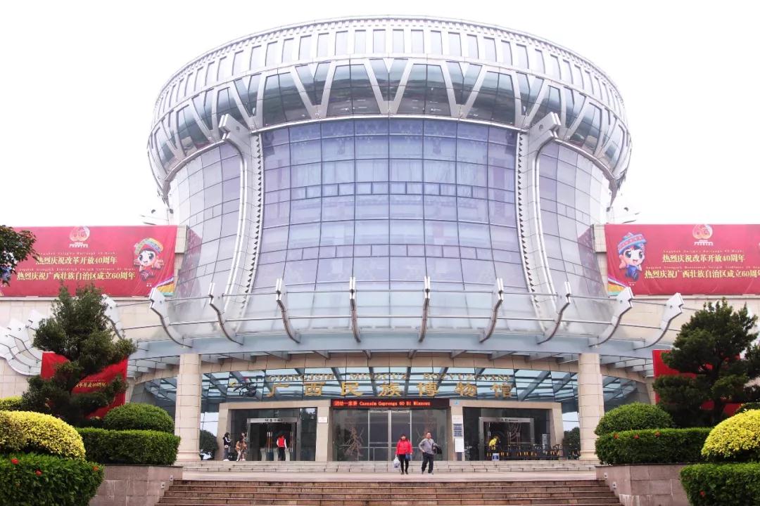 廣西民族博物館主體建筑外形取材于富有廣西地域特色和民族特色的銅鼓,整個建筑宛如一只展翅高飛的鯤鵬,遨游于青山綠水之間。