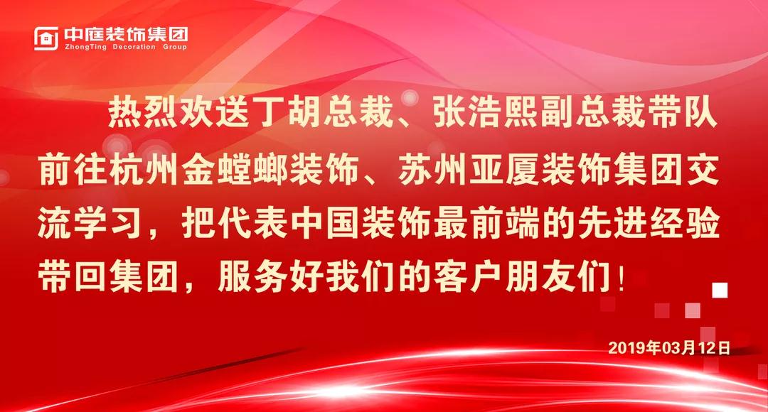2019年3月12日,集團總裁丁胡、副總裁張浩熙帶隊前往杭州金螳螂裝飾、蘇州亞廈裝飾集團交流學習。