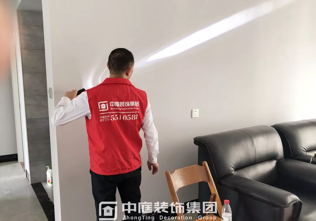 利用強光手電筒檢查墻面平整度及陰角是否達到集團施工標準