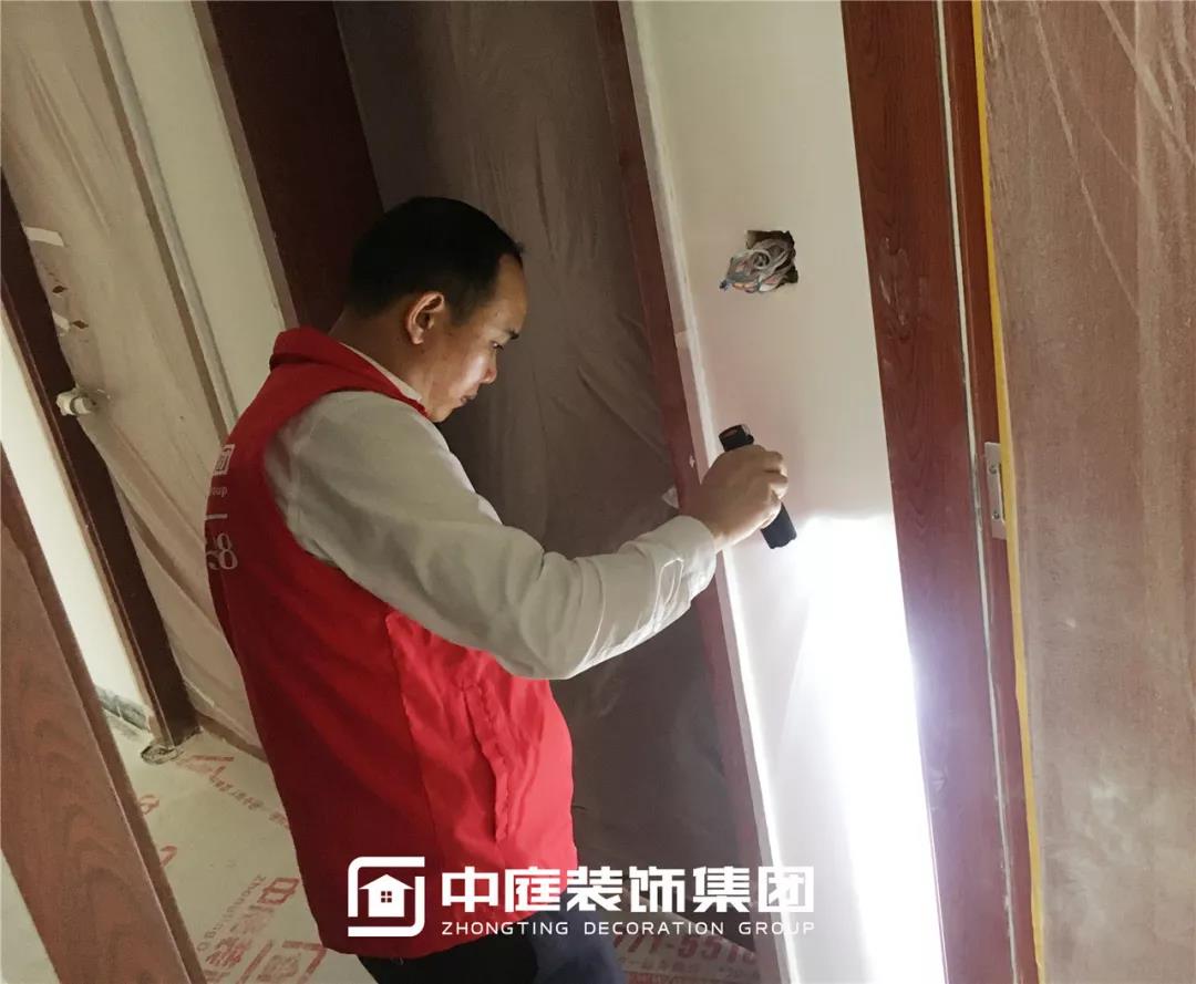 使用強光手電檢查陰角膩子施工打磨情況,工地大巡檢,不放過任何一個角落