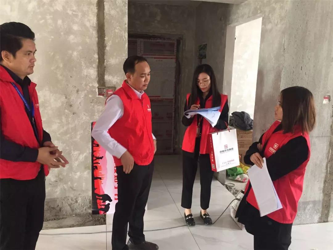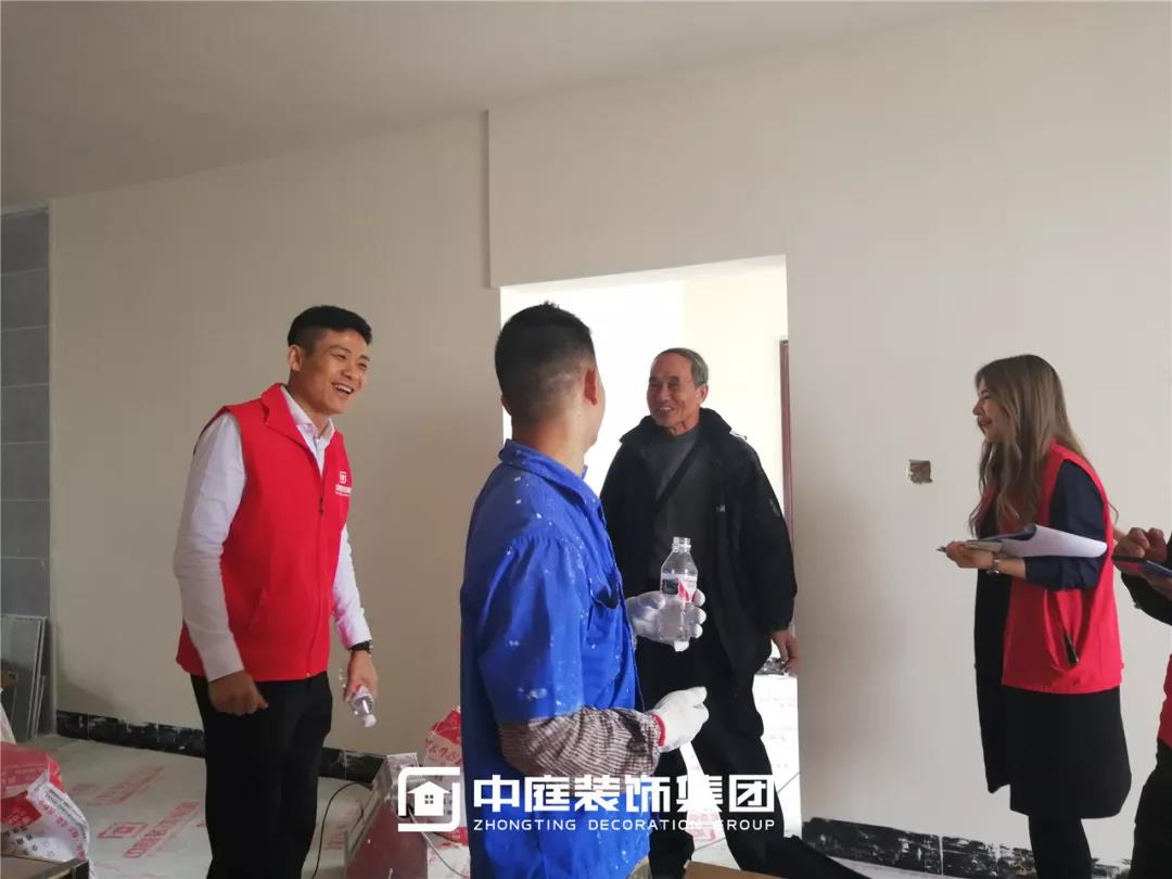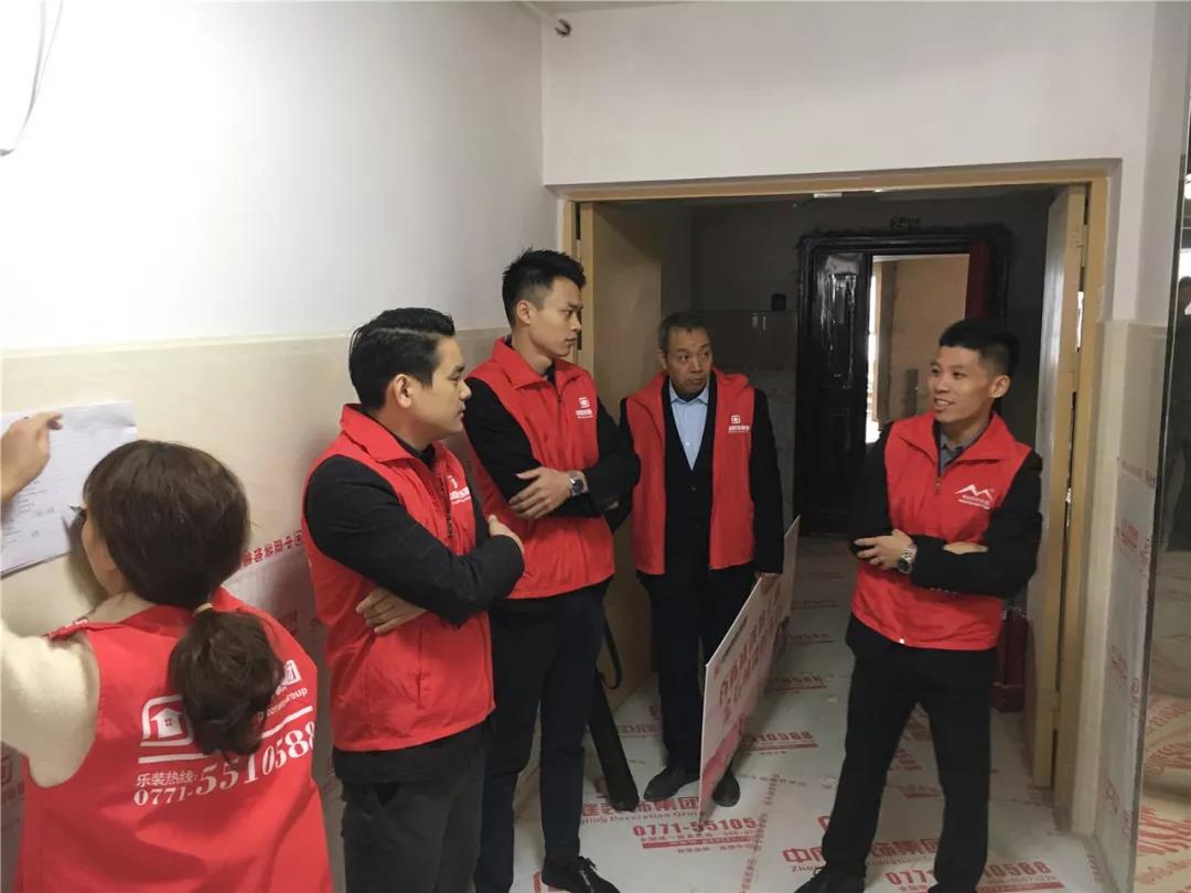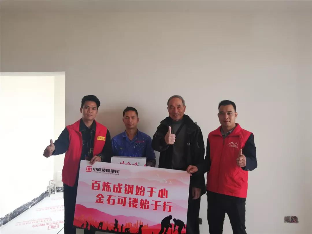 丁胡總裁與業主、施工師傅交流膩子施工情況;交流過程中明顯可以看出師傅和業主朋友的關系非常融洽,巡檢現場其樂融融。
