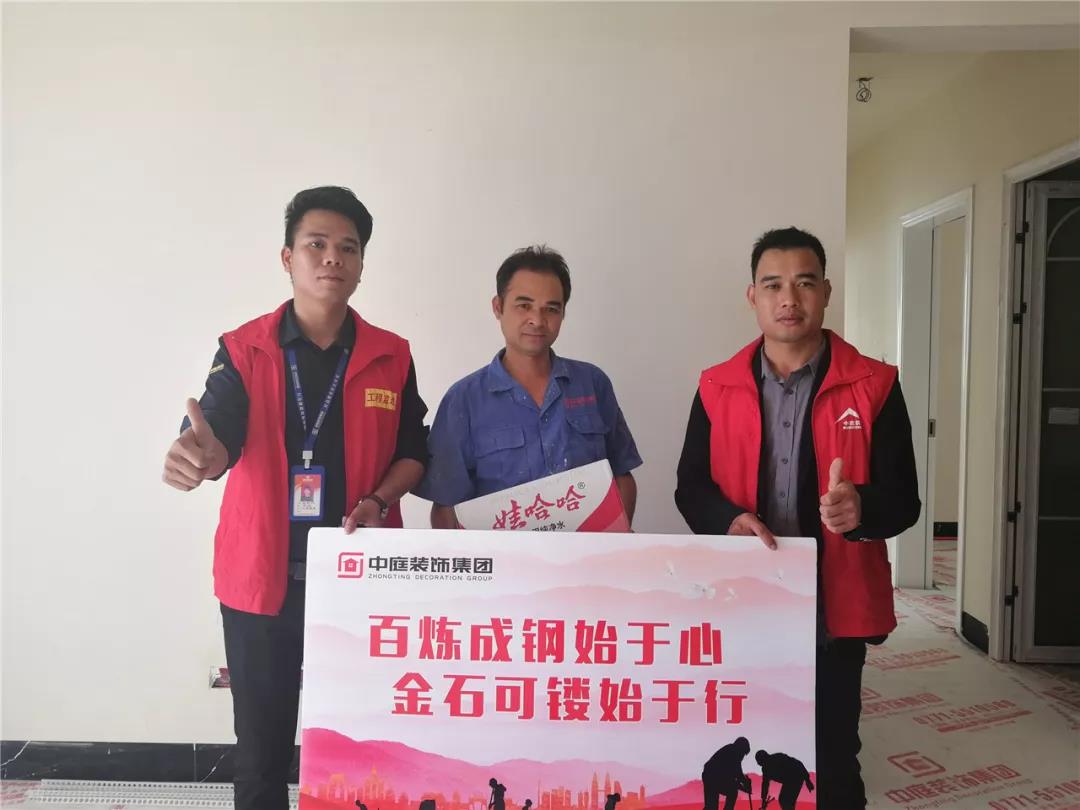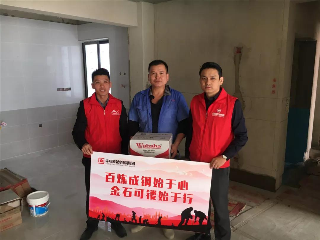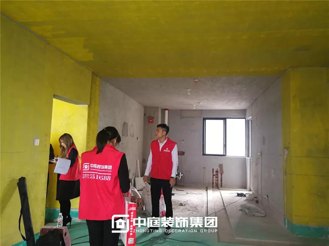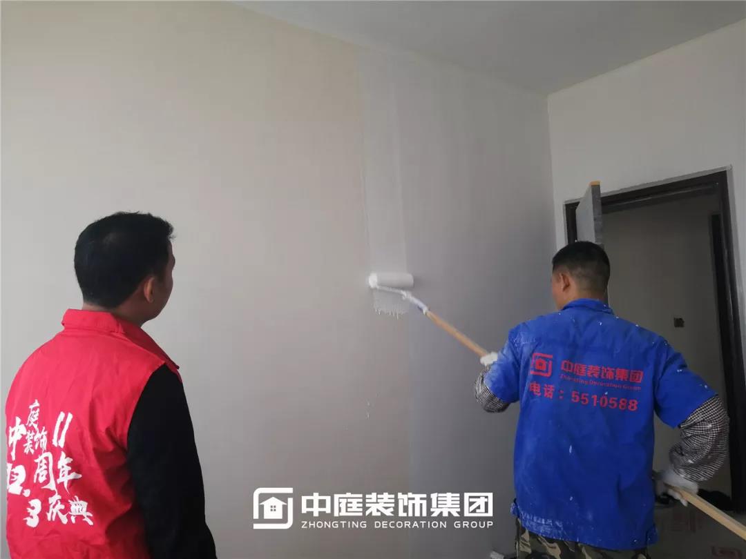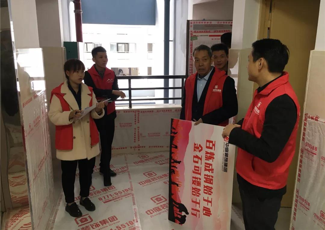 丁胡總裁與業主、施工師傅交流膩子施工情況;交流過程中明顯可以看出師傅和業主朋友的關系非常融洽,巡檢現場其樂融融。