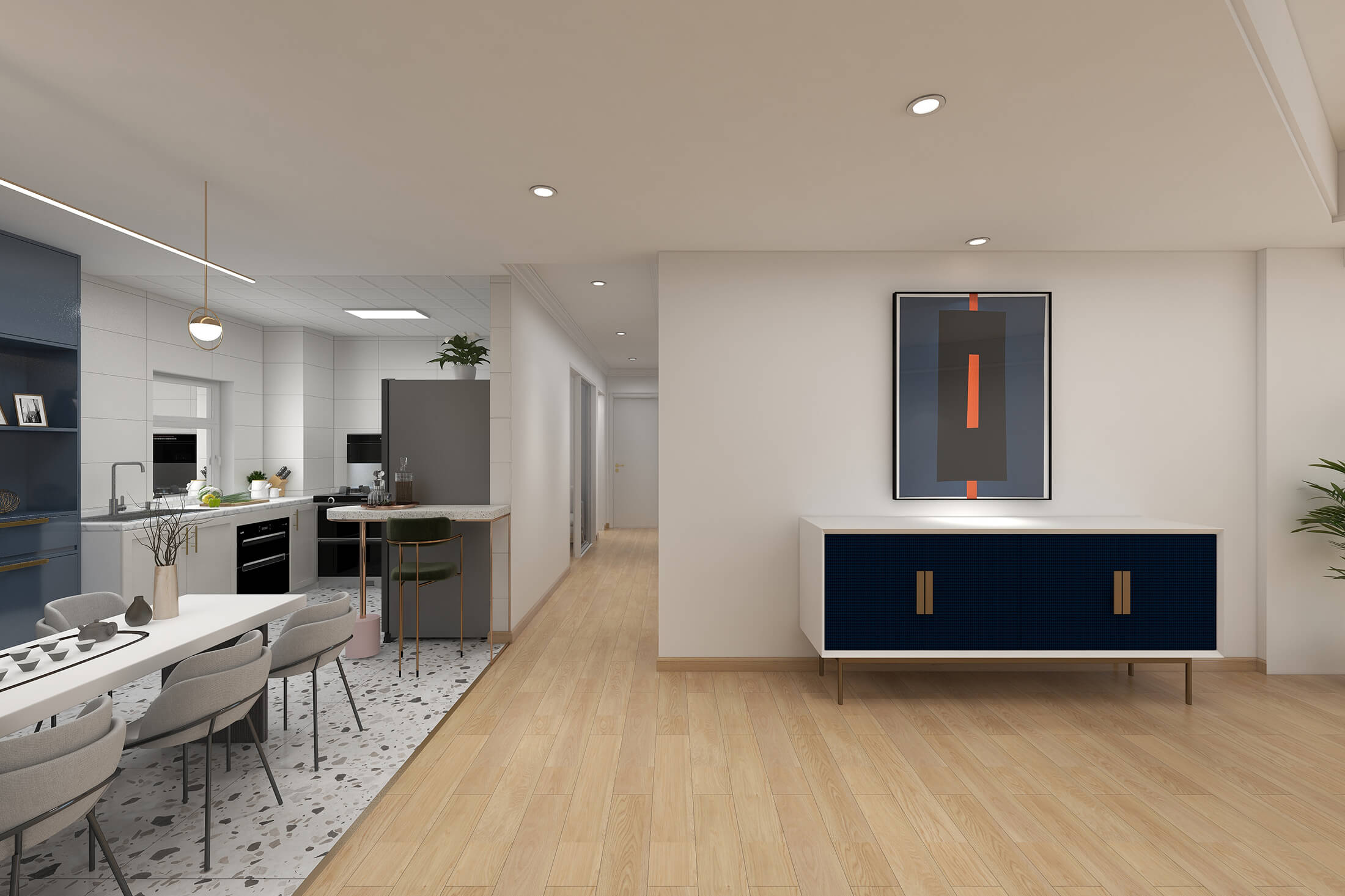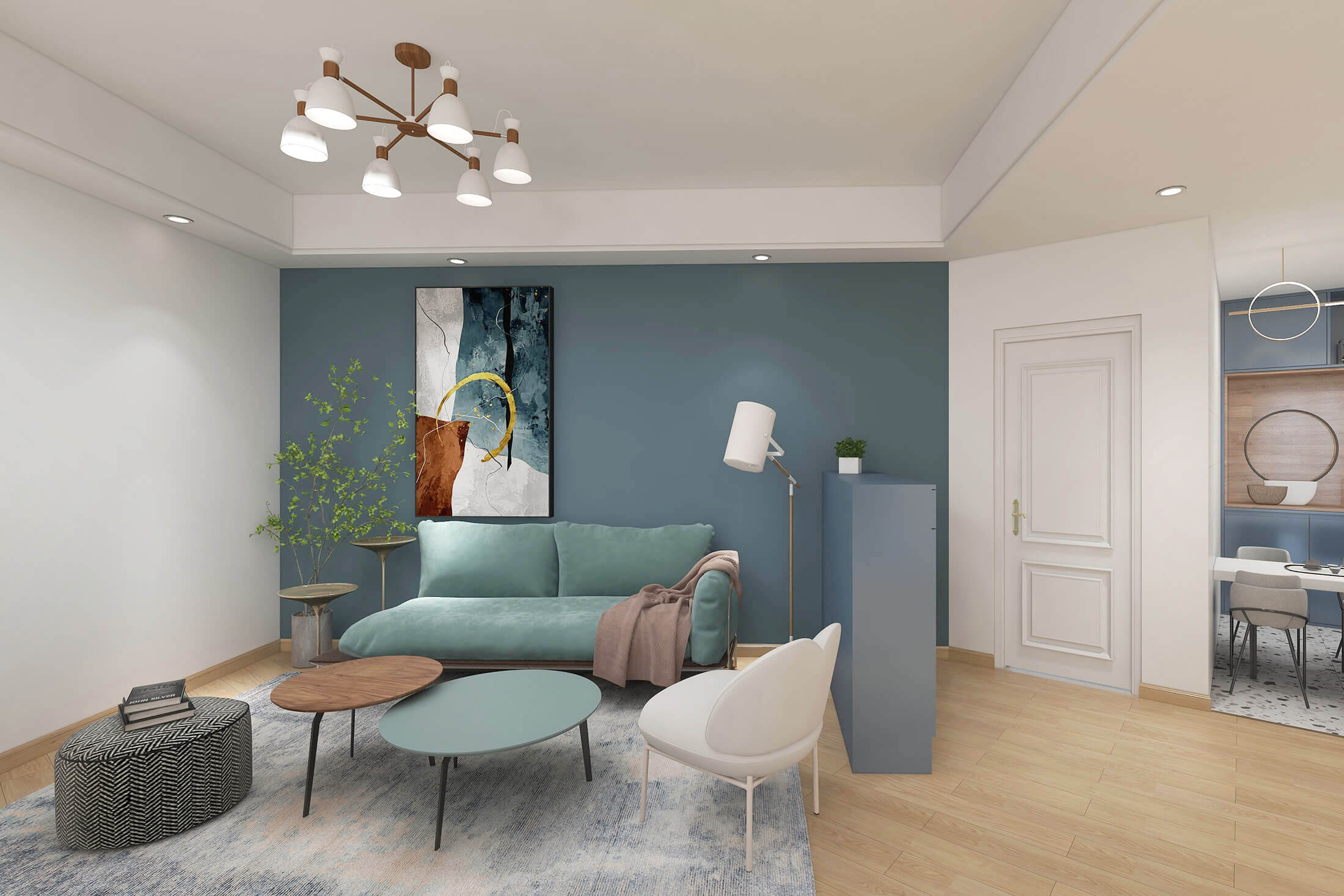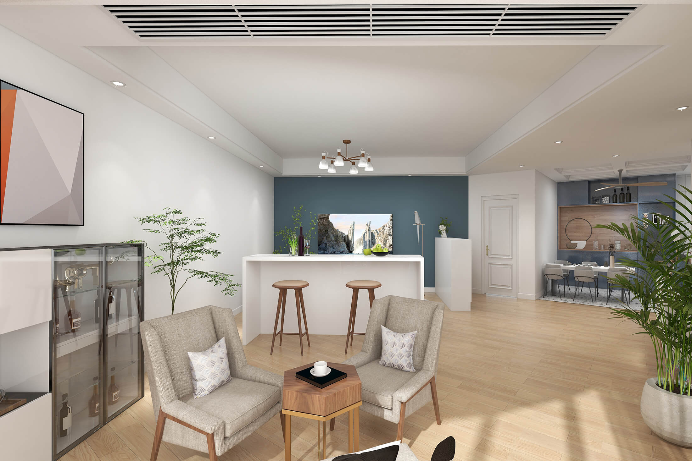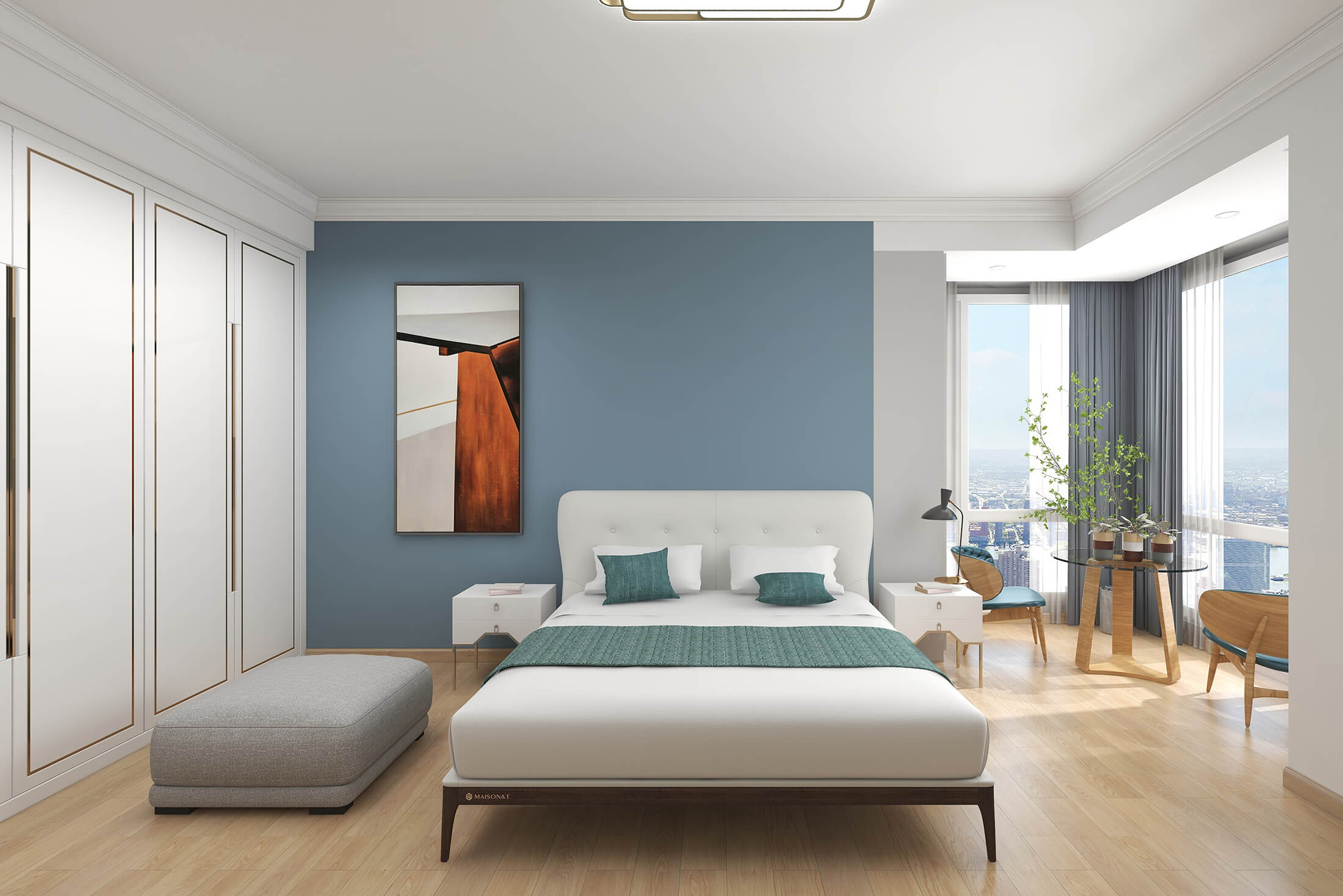 本案戶型為:4室2廳2衛,總面積119㎡。現代簡約風格,顧名思義,就是讓所有的細節看上去簡潔大氣,業主追求簡素淡雅之美,希望加入現代元素。設計師將材料、色彩、燈光及元素進行簡化,用簡潔的視覺效果營造出淡然清雅、寧靜超脫的氛圍。
