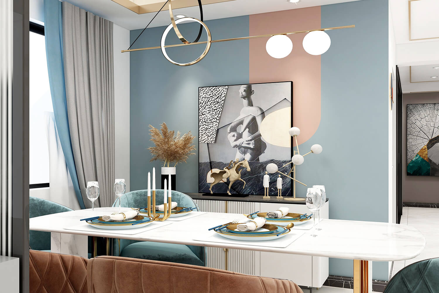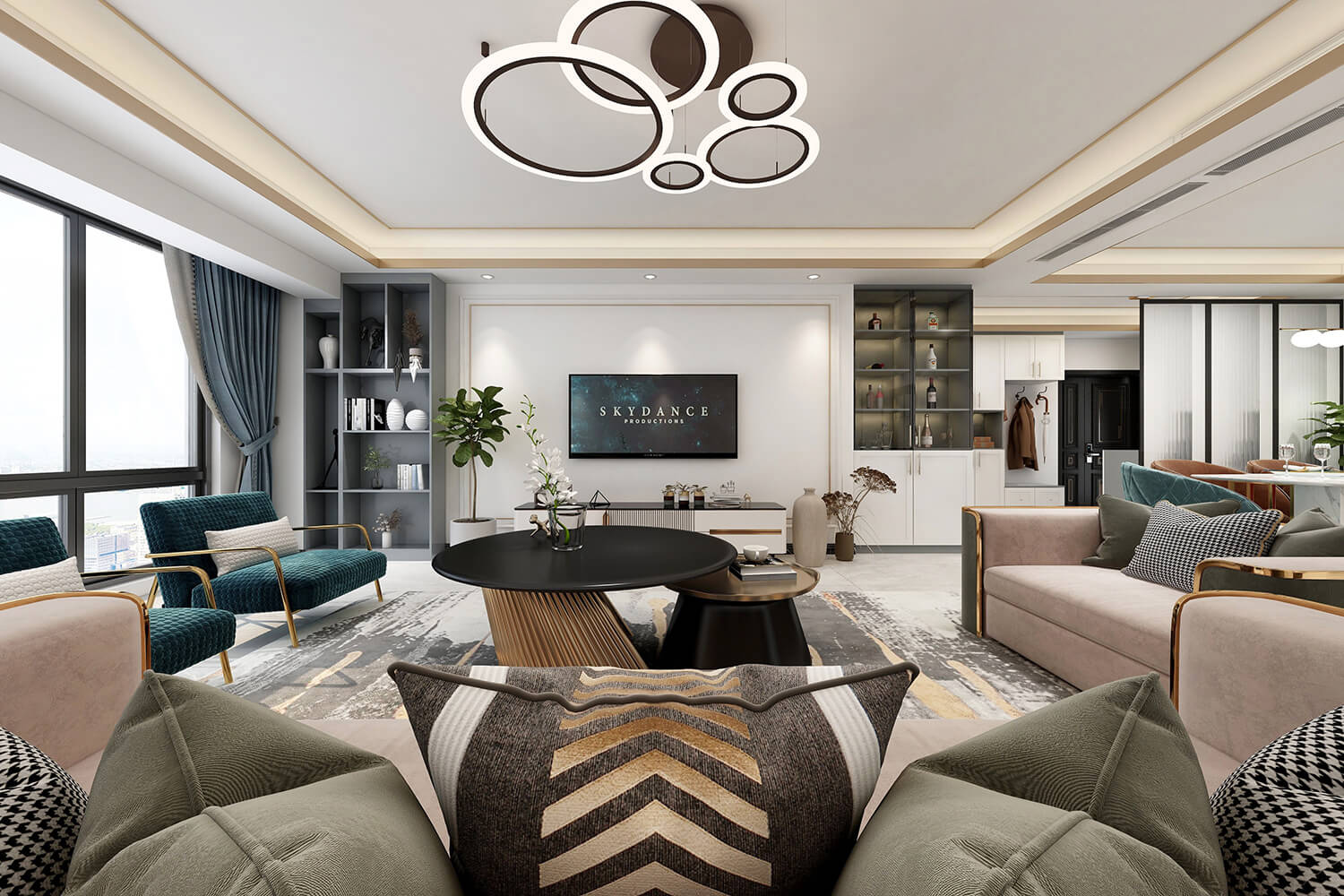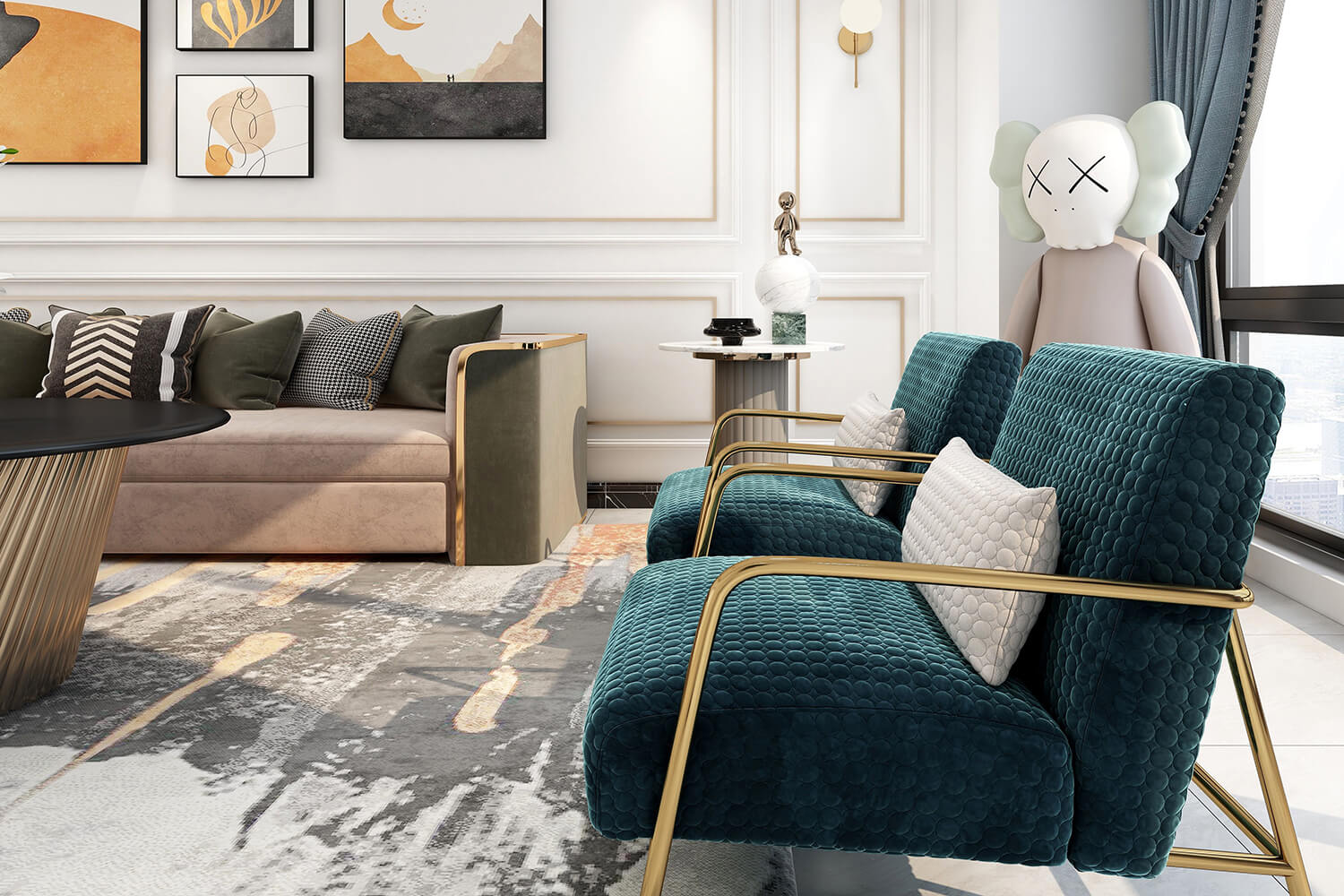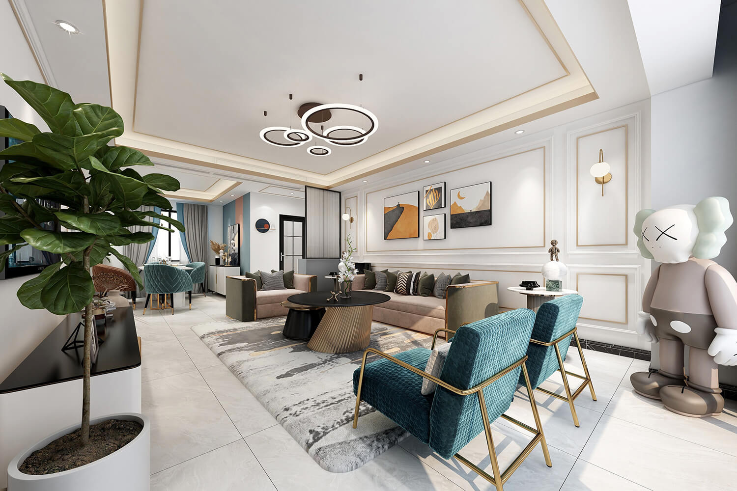 本案總面積118㎡,整體配色以白色為主色調,用充滿清新氣息的綠與藍為空間帶來清爽感覺,點亮空間視覺色彩感知,展現別具一格的視覺感,華麗的金屬色澤增添輕奢質感。