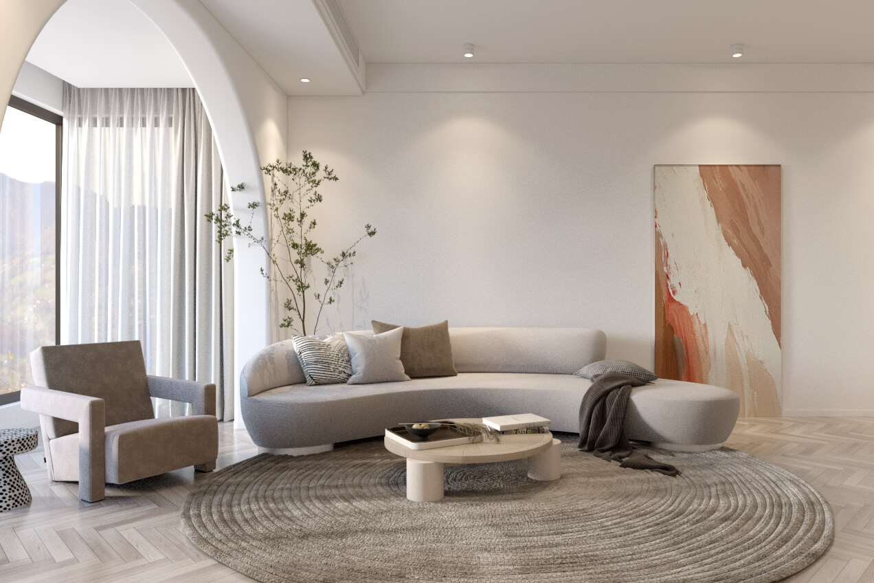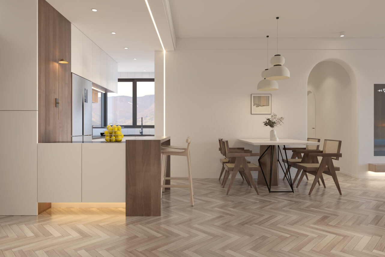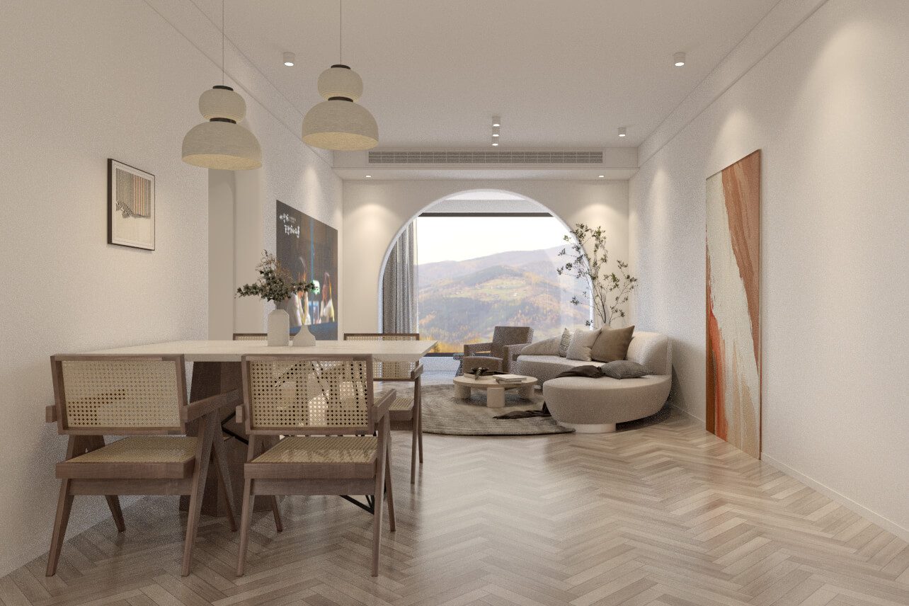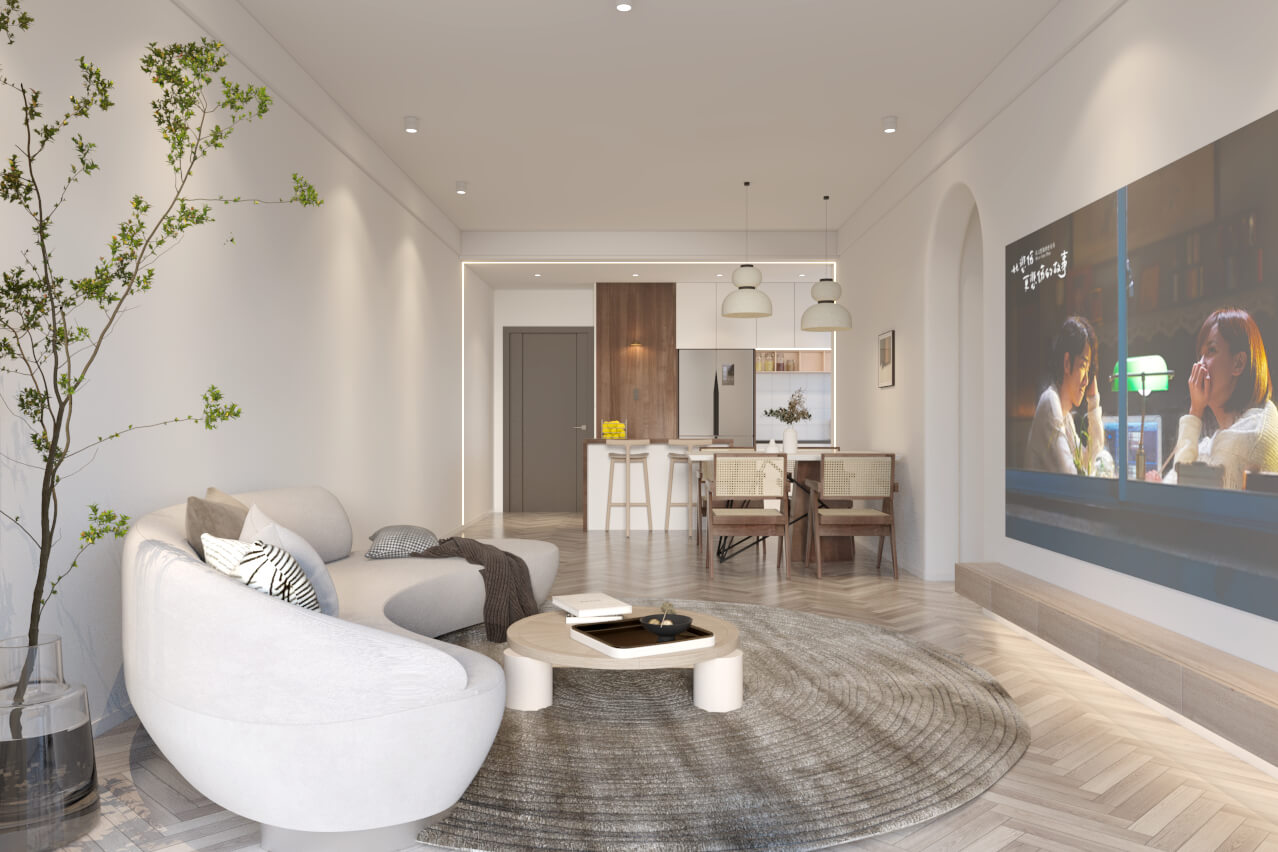 本案總面積101㎡。業主喜歡簡單干凈,又帶一點法式的浪漫。設計師根據業主的喜好與需求,整體以白色為主,再用淺咖啡、褐色作為點綴,整體自然又溫馨,簡單的造型營造溫馨感與美感。