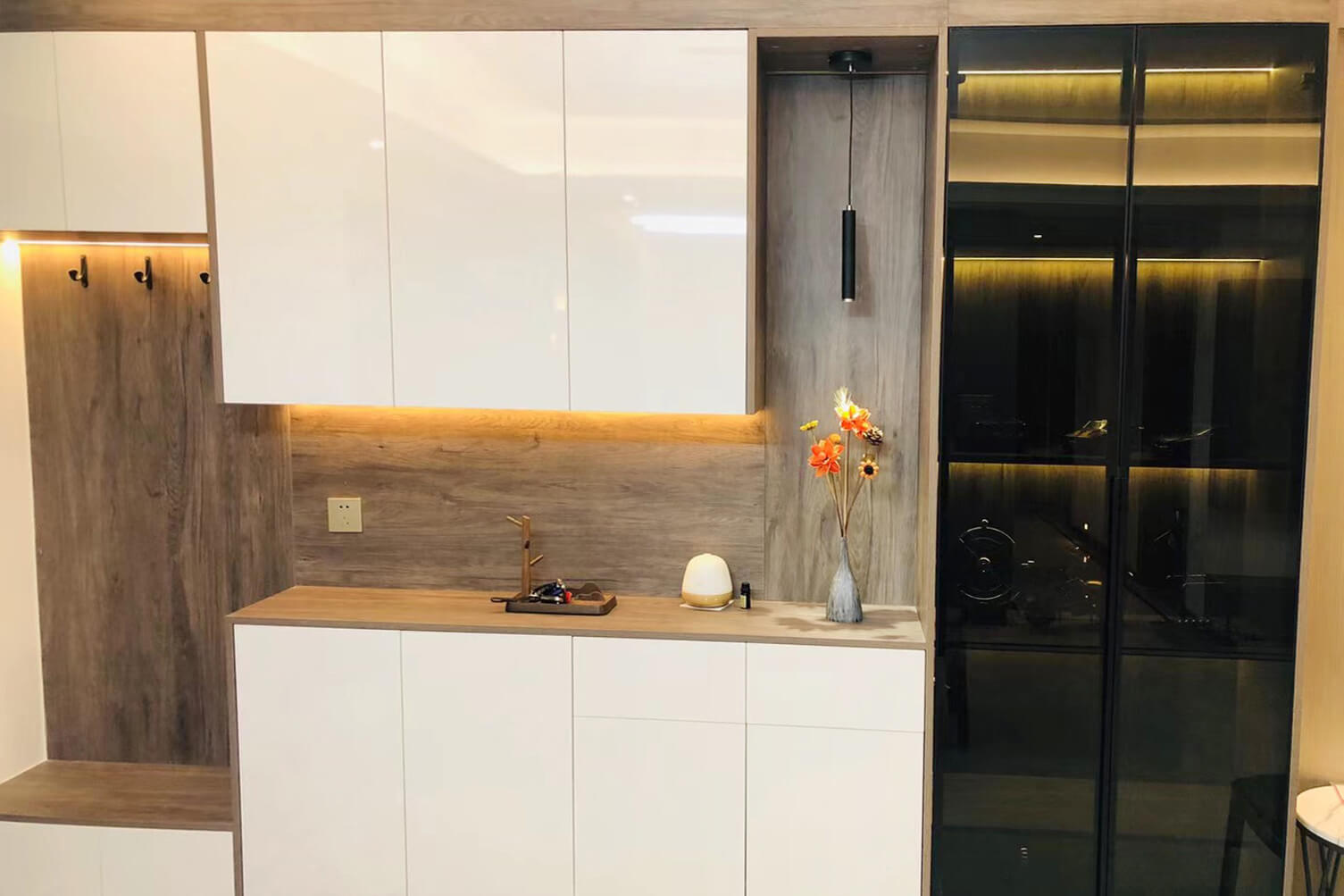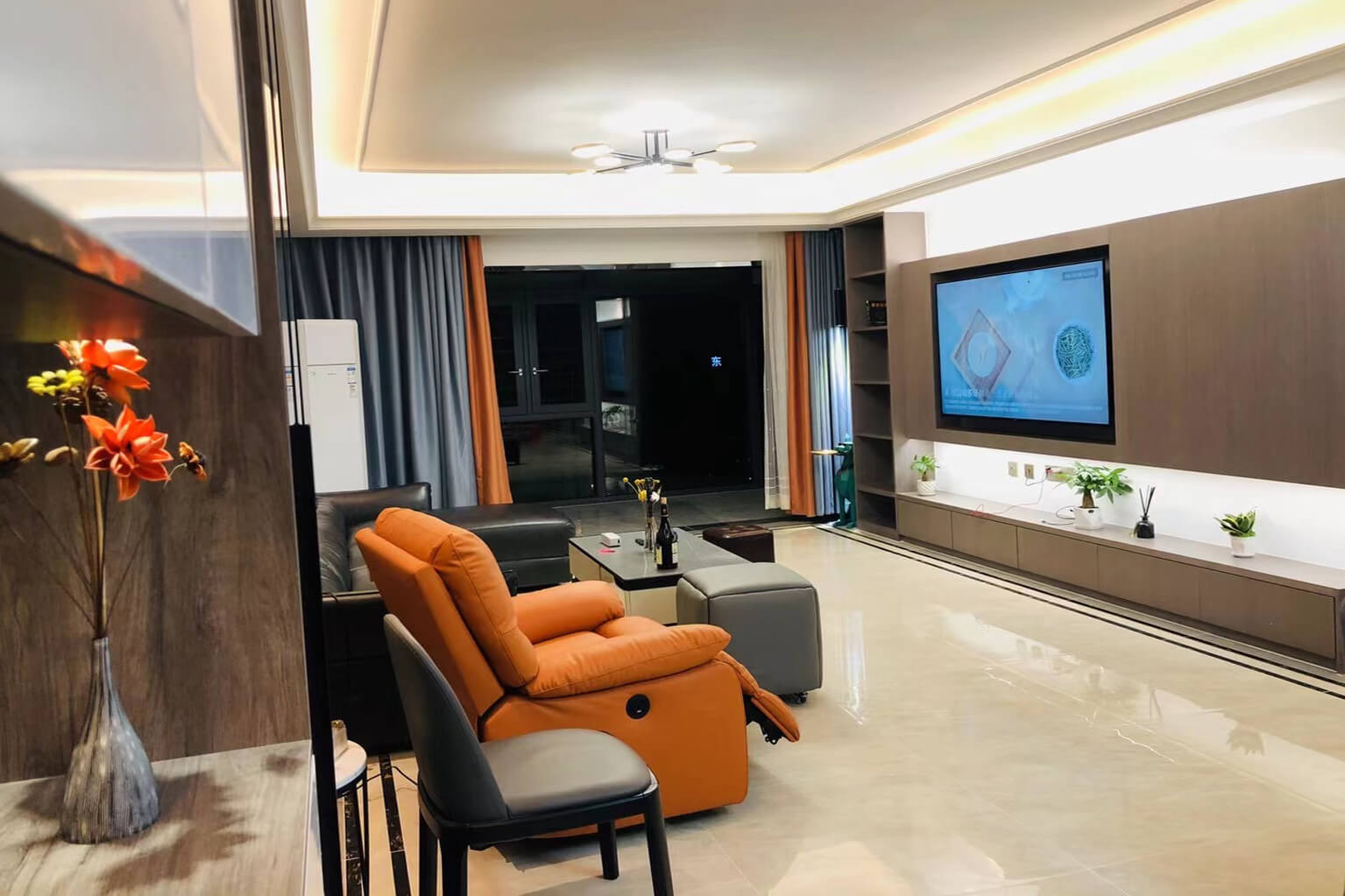 瀏覽量:344客餐廳選擇素色的木飾面顯現低調有內涵,整個客廳及餐廳的吊頂直接一體貫穿,搭配著電視背景墻長方體設計突顯空間的寬闊大氣,愛馬仕橙色的窗簾及單人沙發的呼應,增添了空間的活躍性;暖黃色燈光下白色的大理石吧臺及白色的高光柜門使得空間不再昏沉,局部黑色的鈦金夾著茶色的鏡面在大面積的素色木飾面的包裹下將現代的低調且奢華體現完美的體現了。