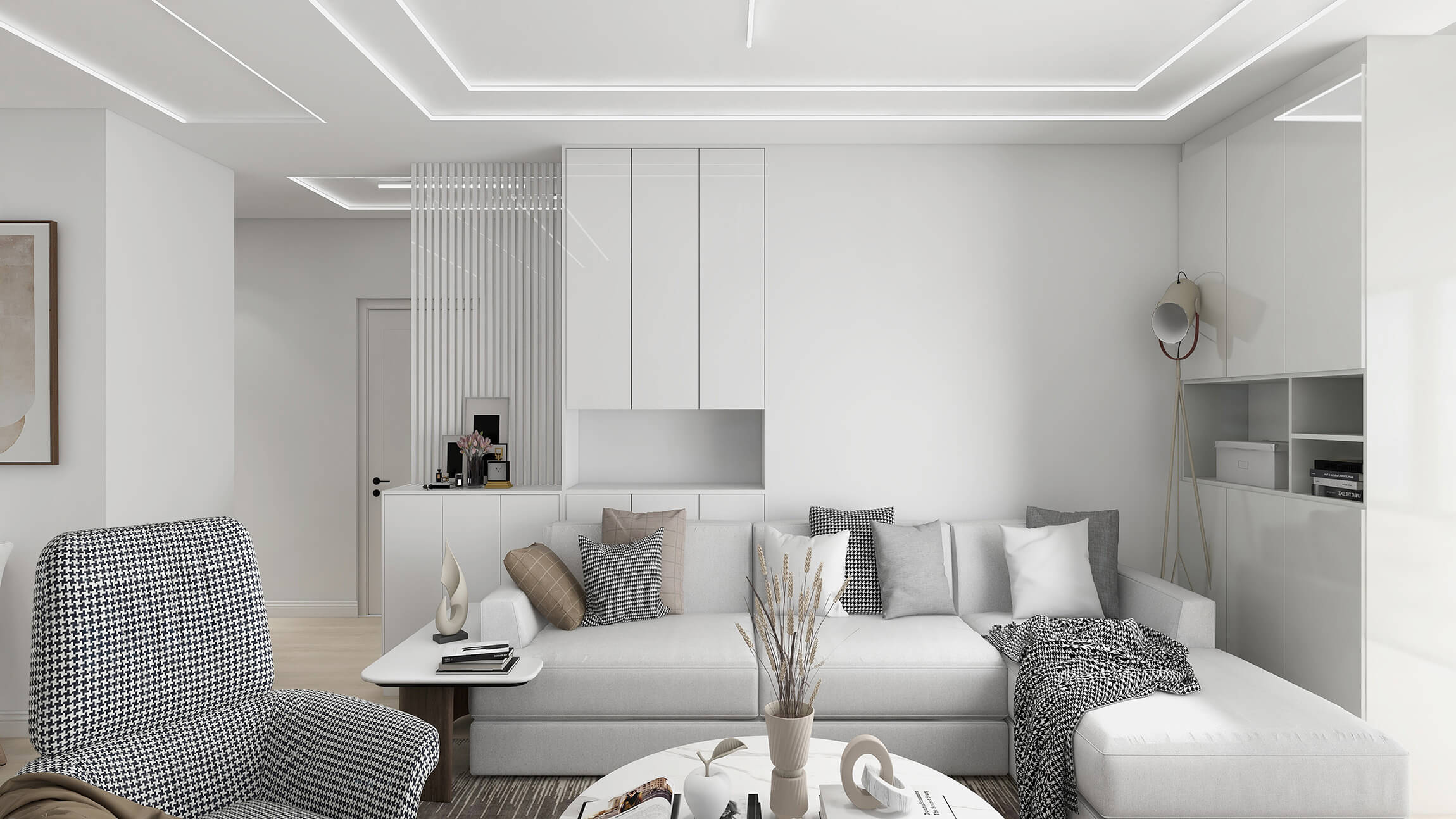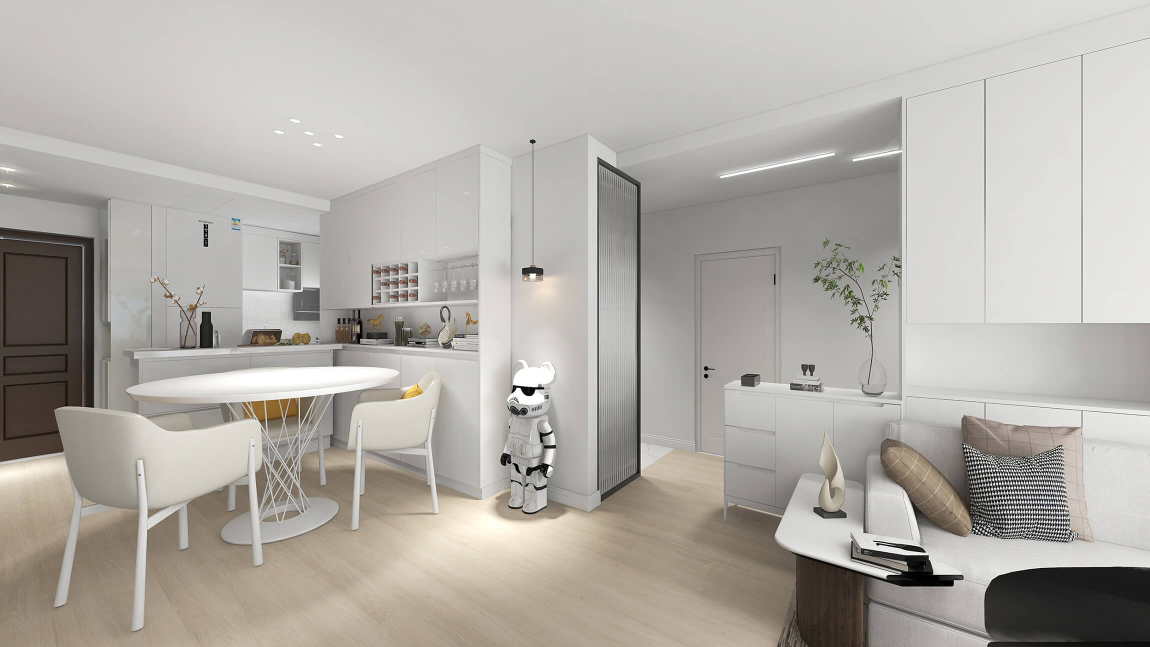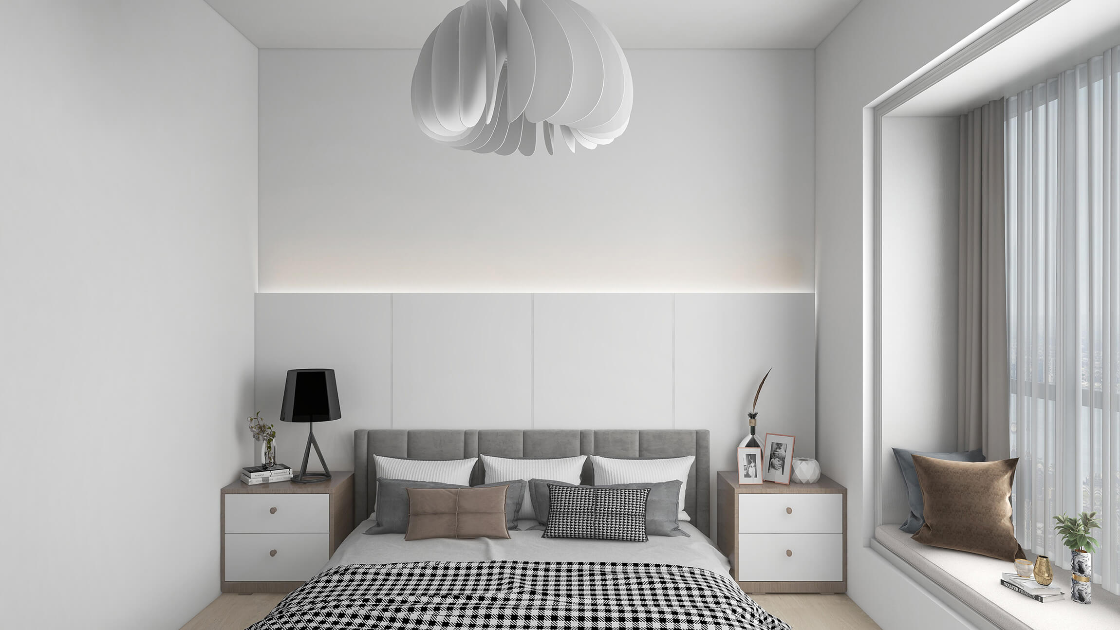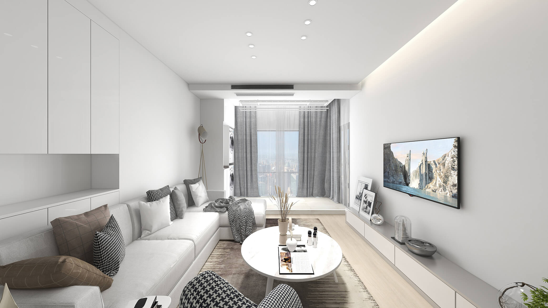 本案戶型為:2房2廳1衛,總面積69㎡。本案為現代簡約風,簡單明了、舒適時尚的空間,沉穩內斂的色調,不失高雅、大氣之感的同時,塑造出獨有質感的現代空間。