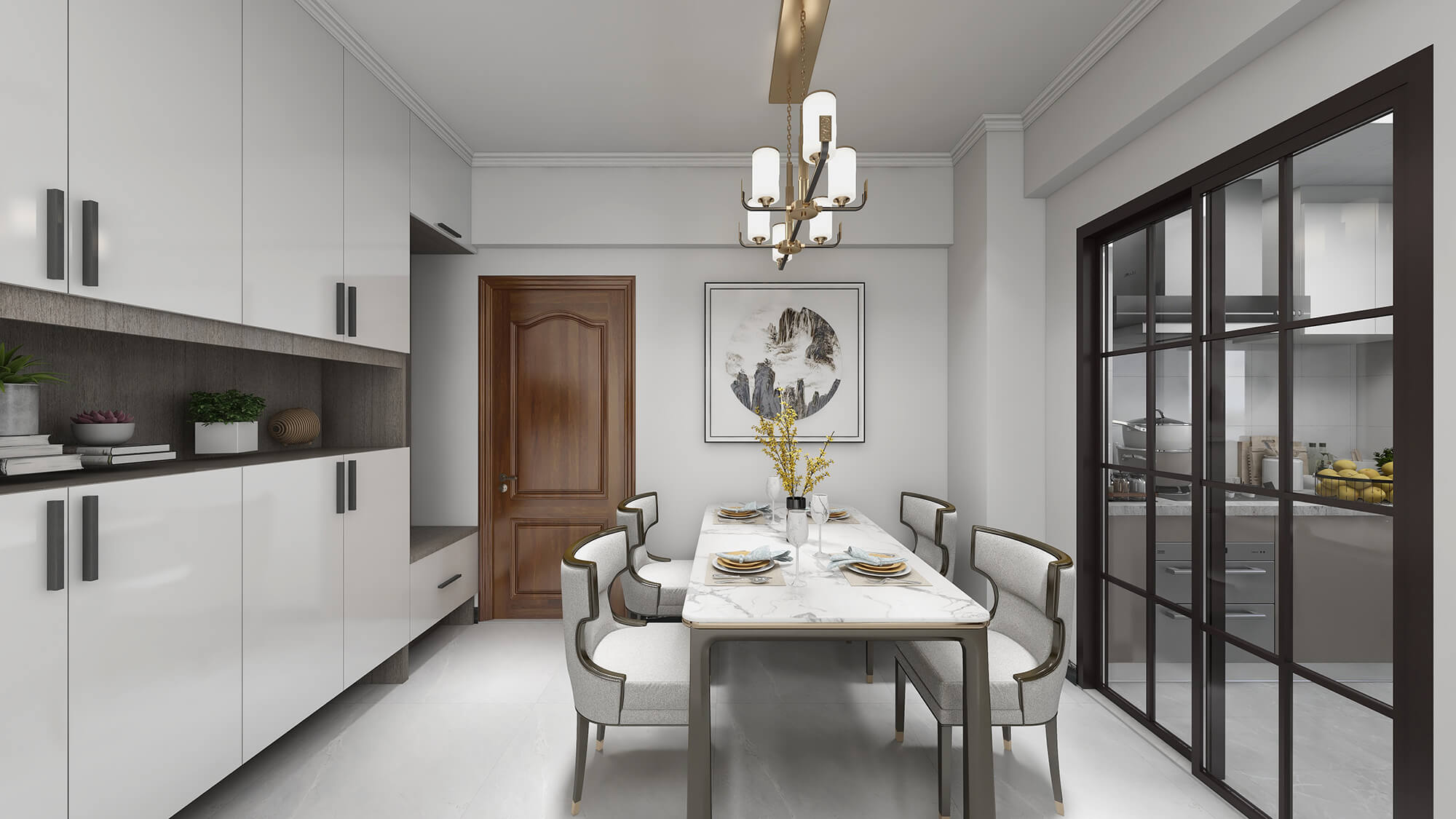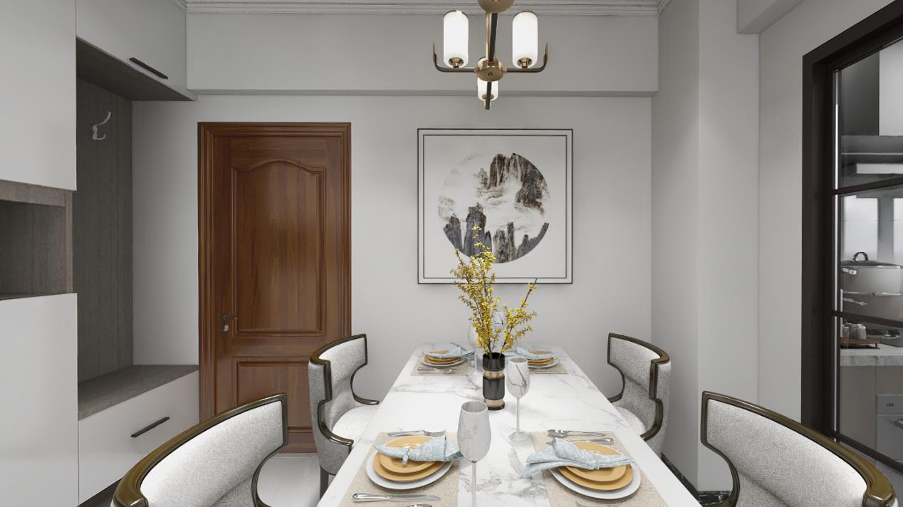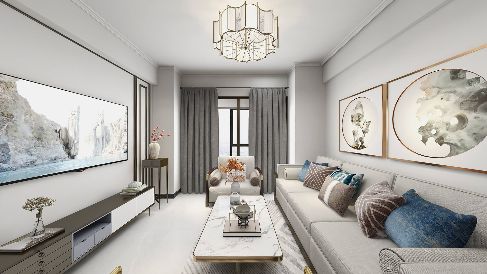 本案戶型為:3房2廳2衛,總面積72㎡。本案風格為新中式,在空間中以淺灰色為主色調,將中式元素以生活的面目表達出來。在造型、擺件等上面采用一些中式手法,為空間增添高雅秀逸的意境美,使得整體空間賞心悅目,并充滿韻味。