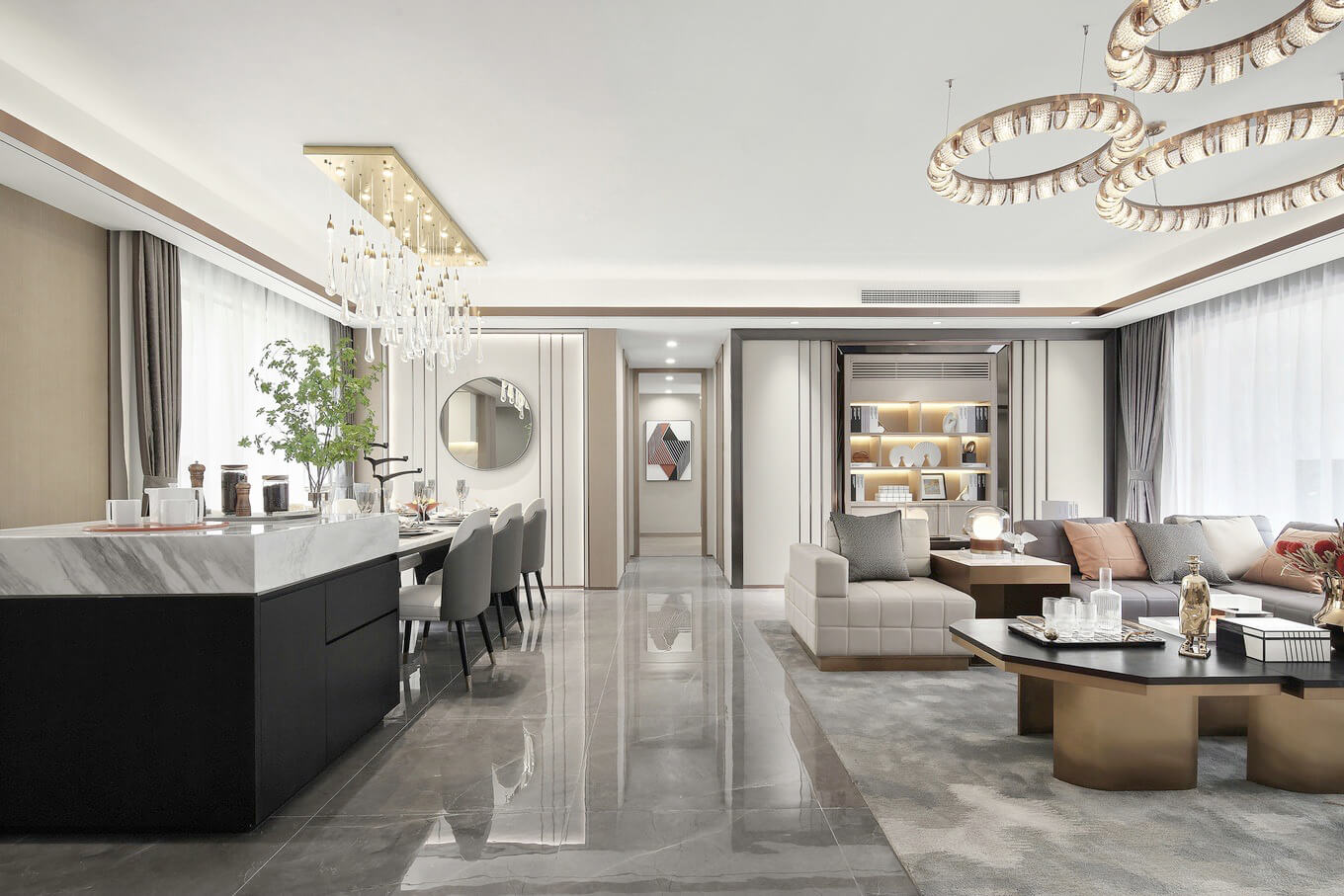 本案總面積為121㎡。設計師以簡潔而高級的設計手法,塑造閑適的生活意境。最大保留自然光線,給予空間輕盈通透的品質感。如此安靜的氛圍中,每天的日常都是如此浪漫。