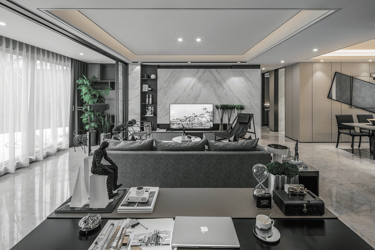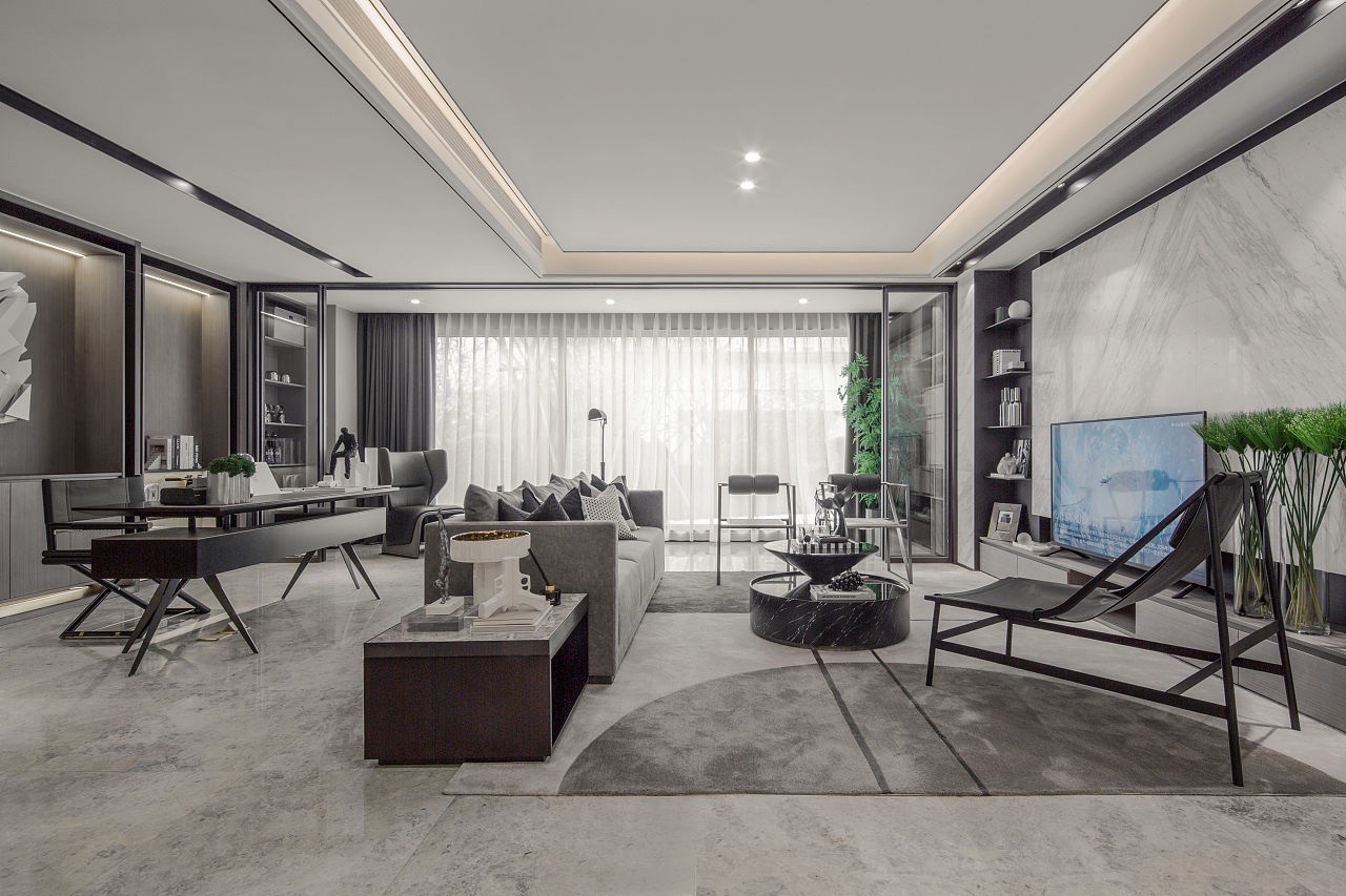 本案為現代簡約風格案例,業主喜歡簡約的黑白灰主色調,設計師以經典而理性的黑白碰撞,鋪陳于極具藝術調性的空間紋理,流暢的線條與留白化的處理,讓空間處處散發精細而不失簡致的都市風尚。