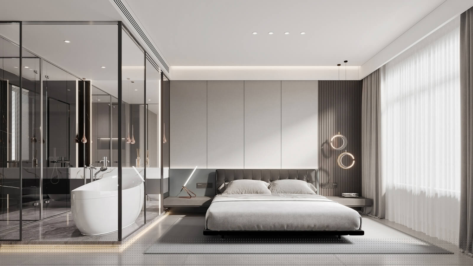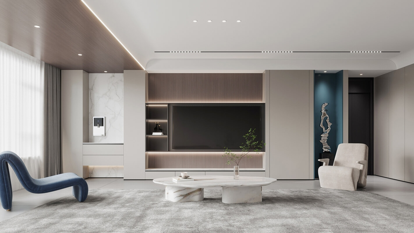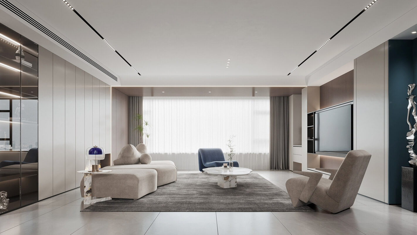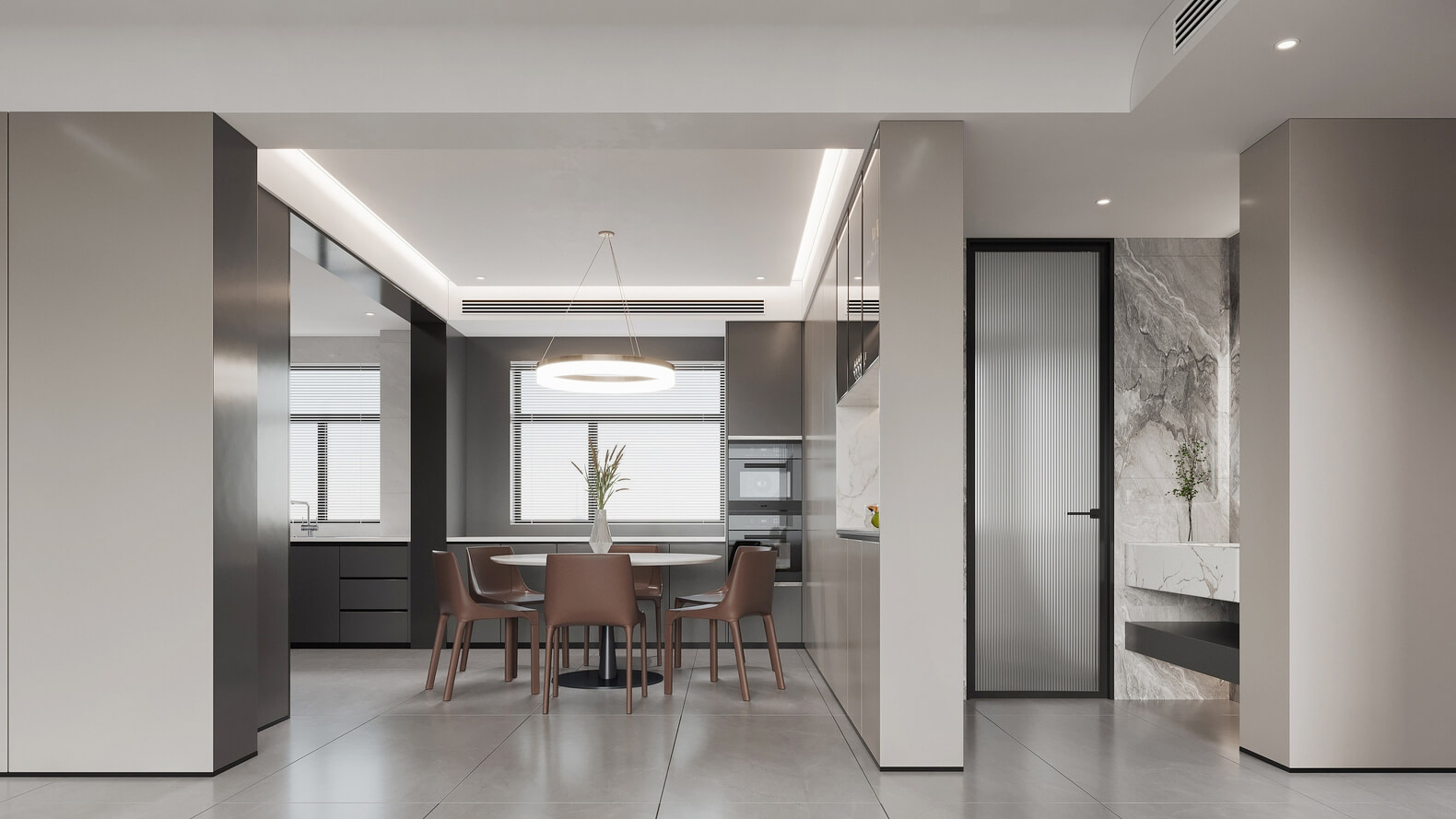 “灰”介于黑與白之間,它模糊著空間的絕對邊界,而“白”是開放,亦是隱藏、極簡。空間以灰和白作為主基調,將自然、柔和、開放的各個功能板塊巧妙地融合,呈現一種清新典雅的高級感。