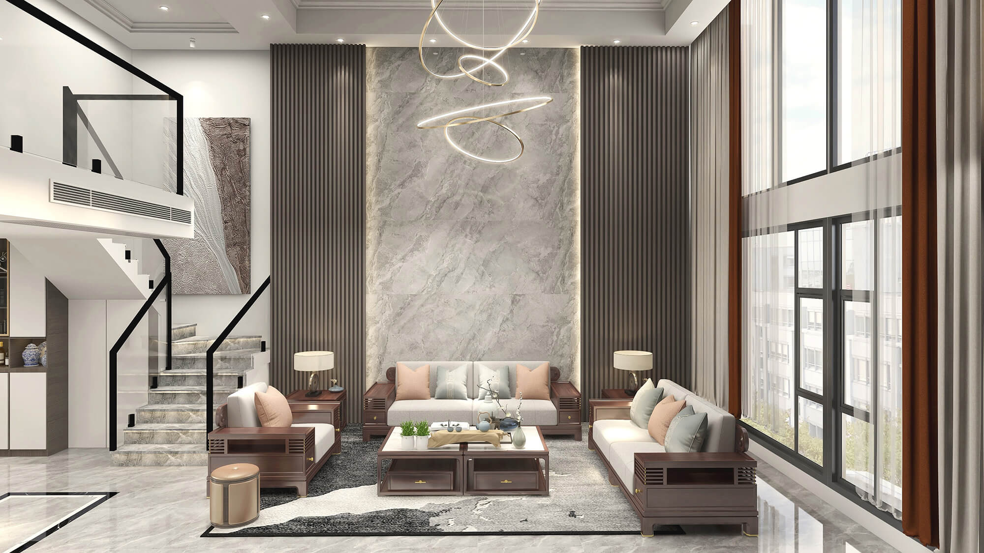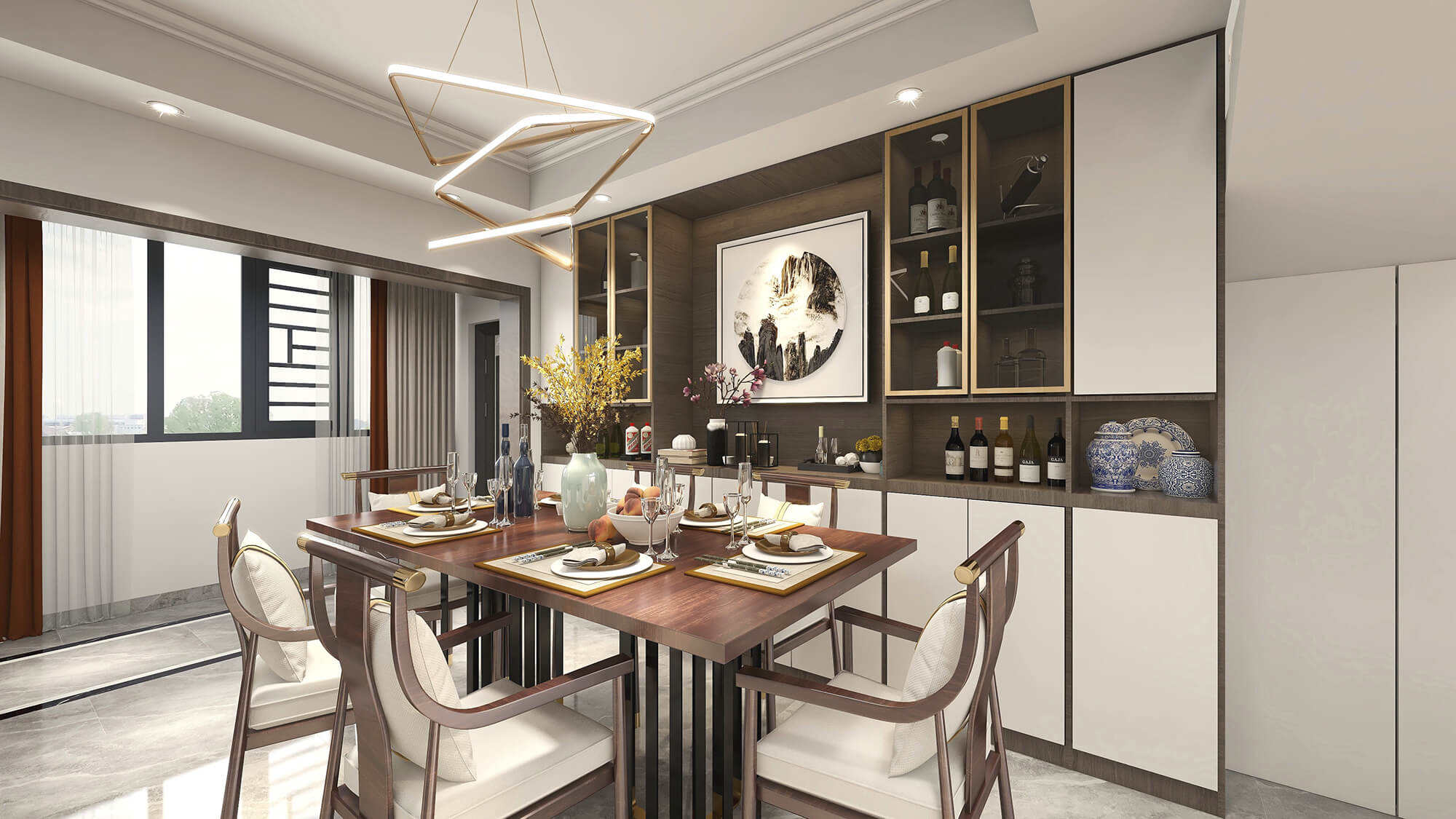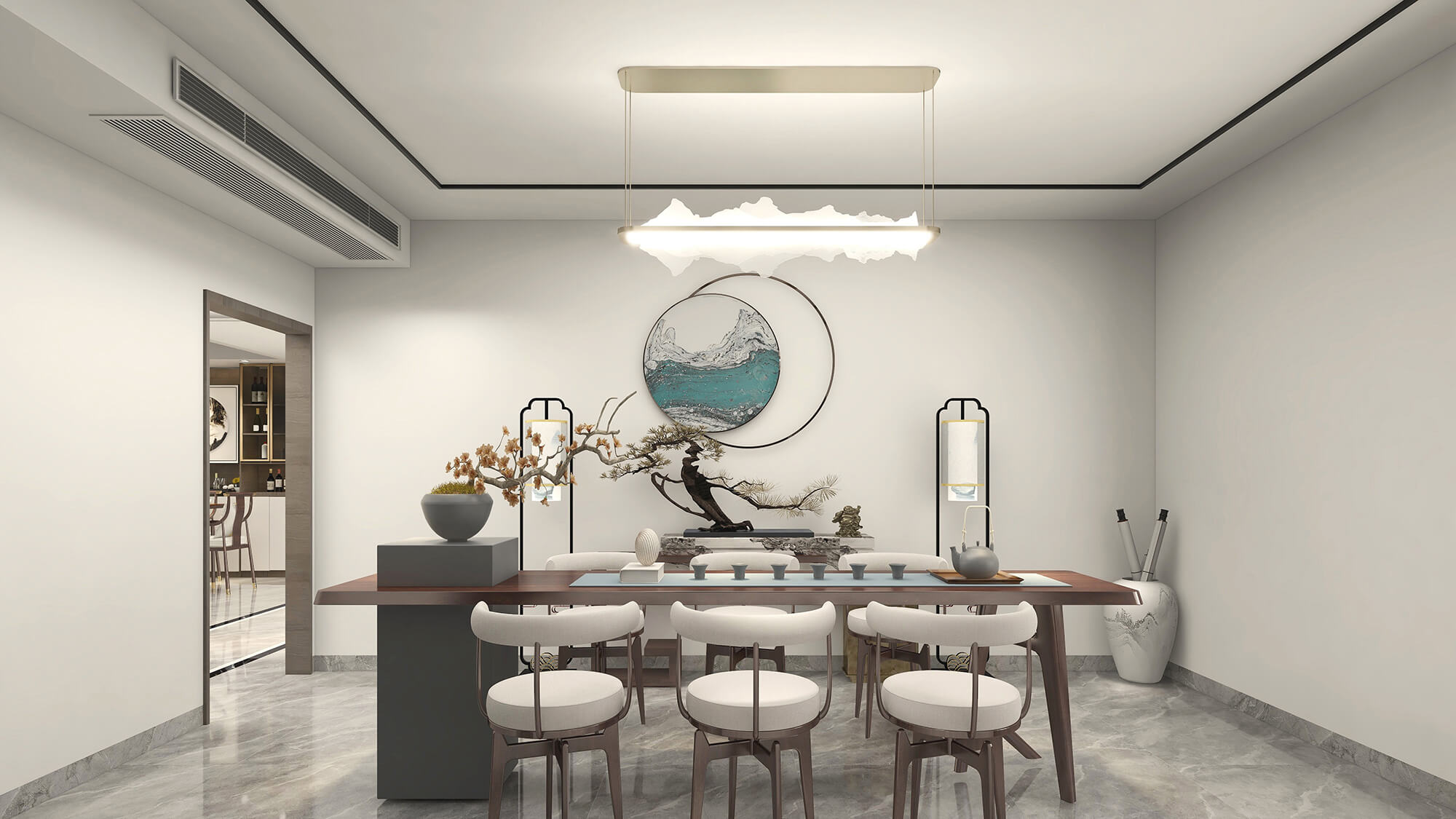 本案為220㎡的新中式風格案例。淡雅的色調,呈現出清亮的質感空間,現代飾品的擺設和新中式家具搭配,勾勒出一個極具格調的精神寧靜地帶。