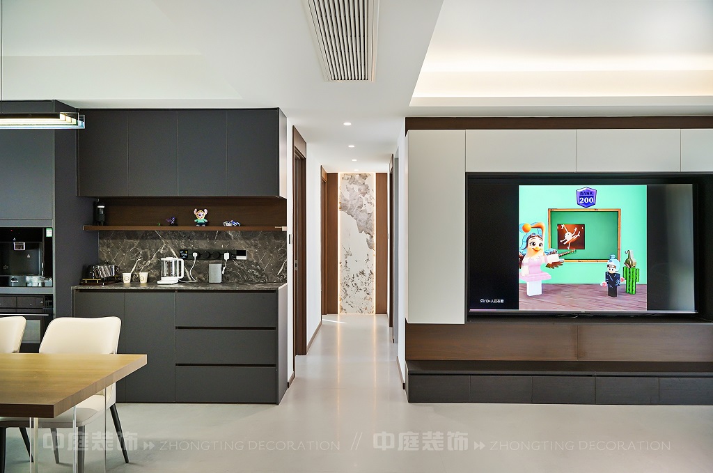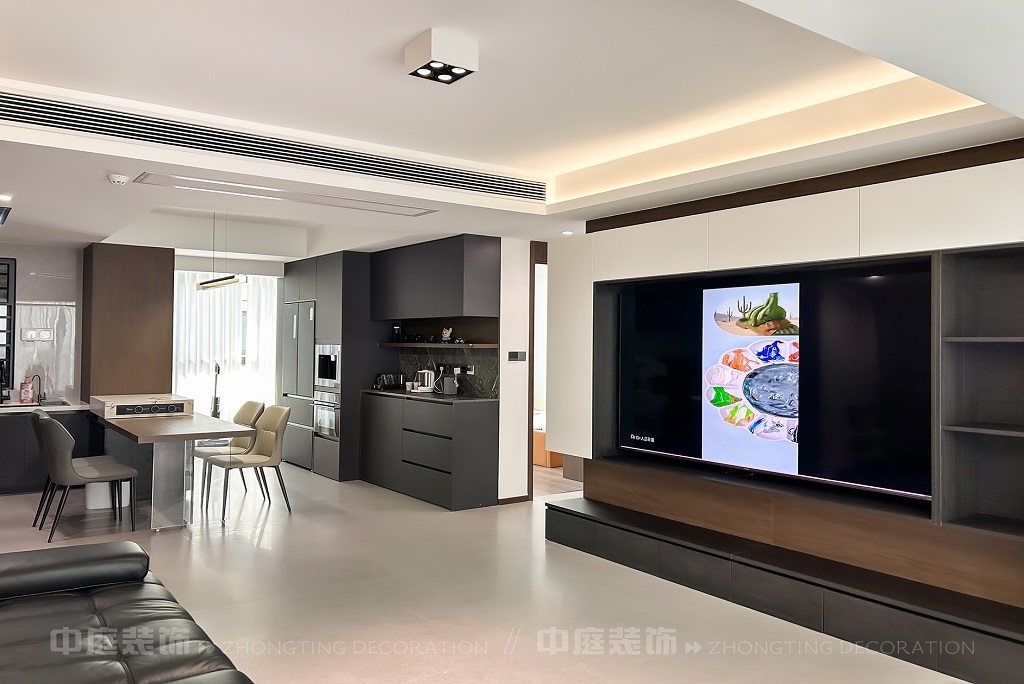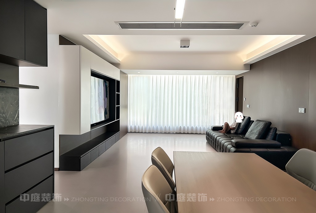 客廳以現代黑白灰極簡風格為核心,大面積白紗簾引入自然光線,黑色皮質沙發質感高級。開放式布局,深灰櫥柜與木質餐桌形成材質對比,線性吊燈提升精致感,功能與美學兼具,營造現代簡約的烹飪用餐氛圍。輕柔窗簾與柔和燈光,打造靜謐休息空間。精致的材質選擇與合理的功能規劃,詮釋了“少即是多”的現代簡約居住美學。