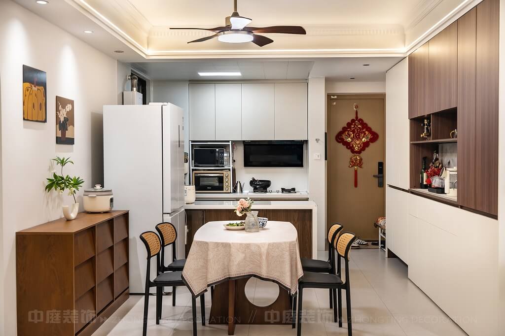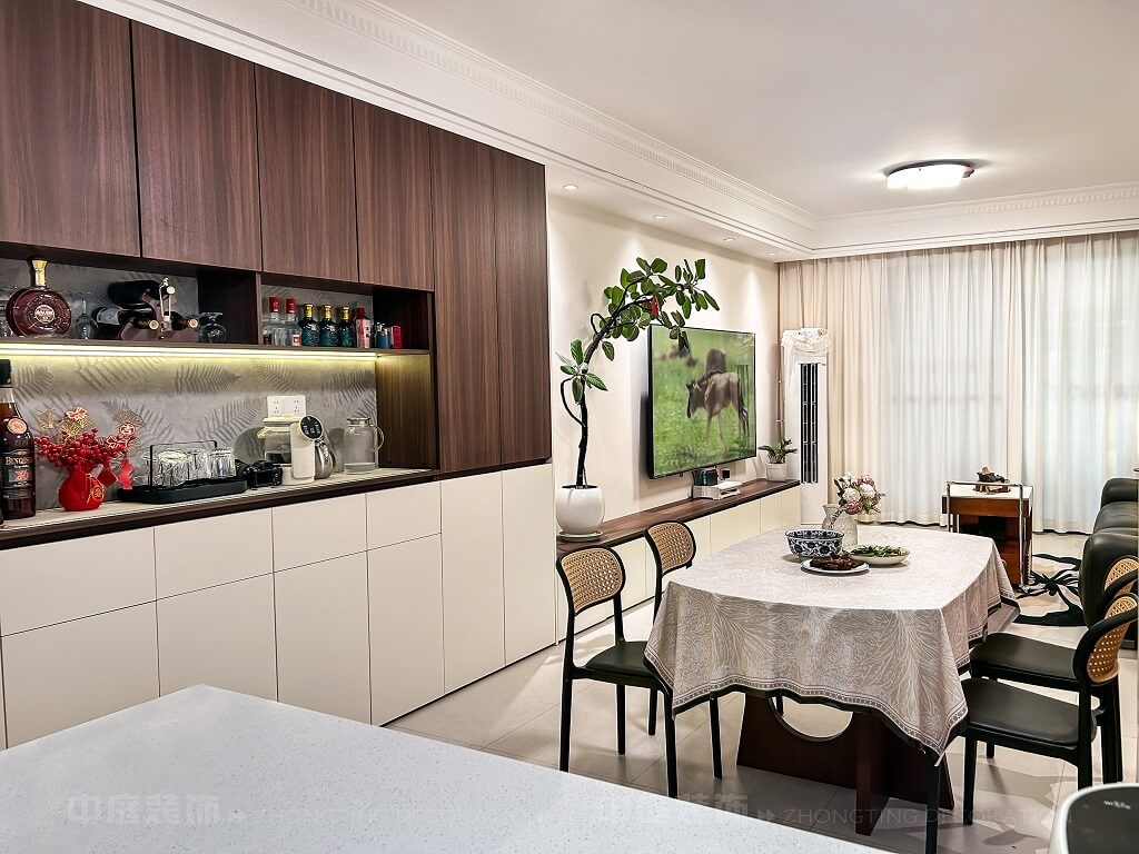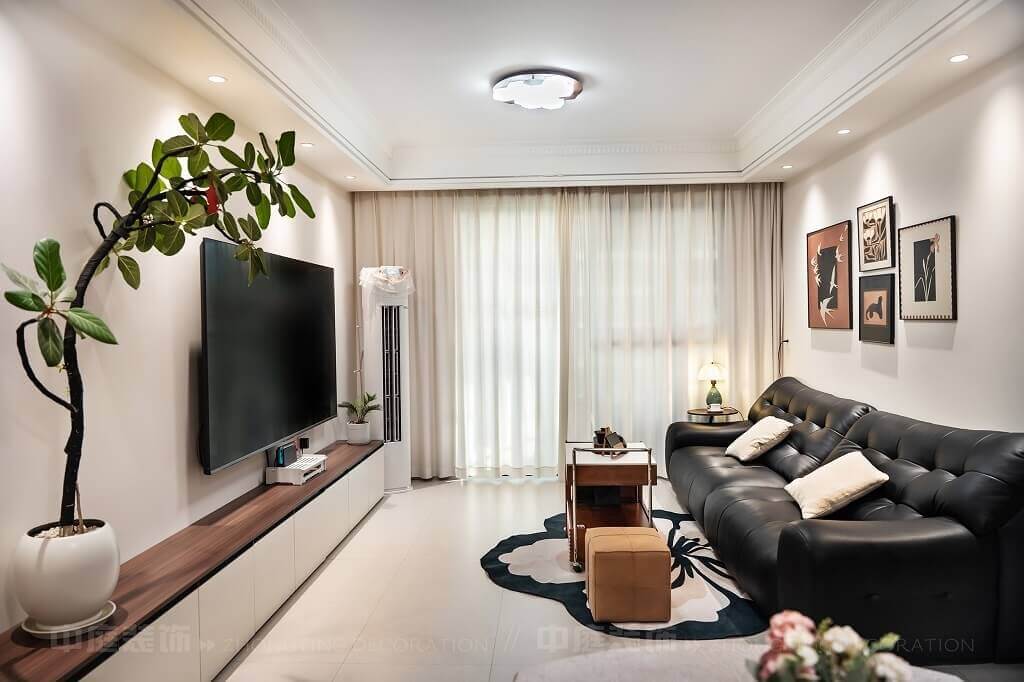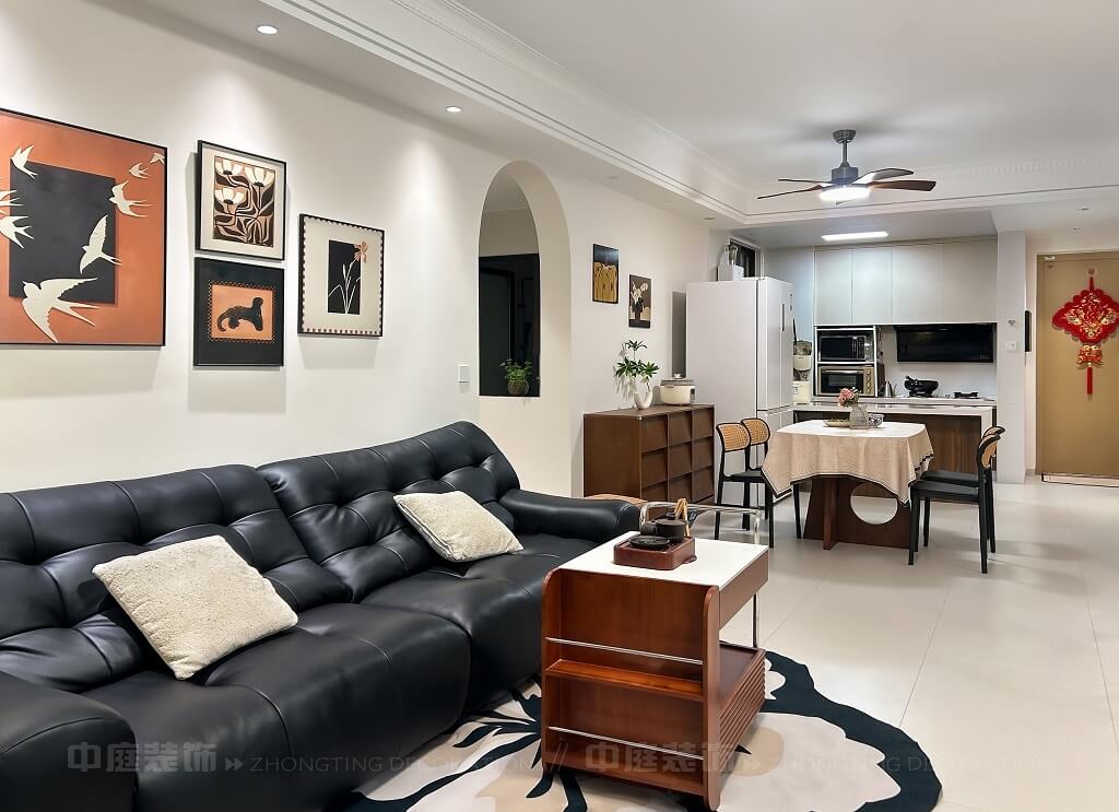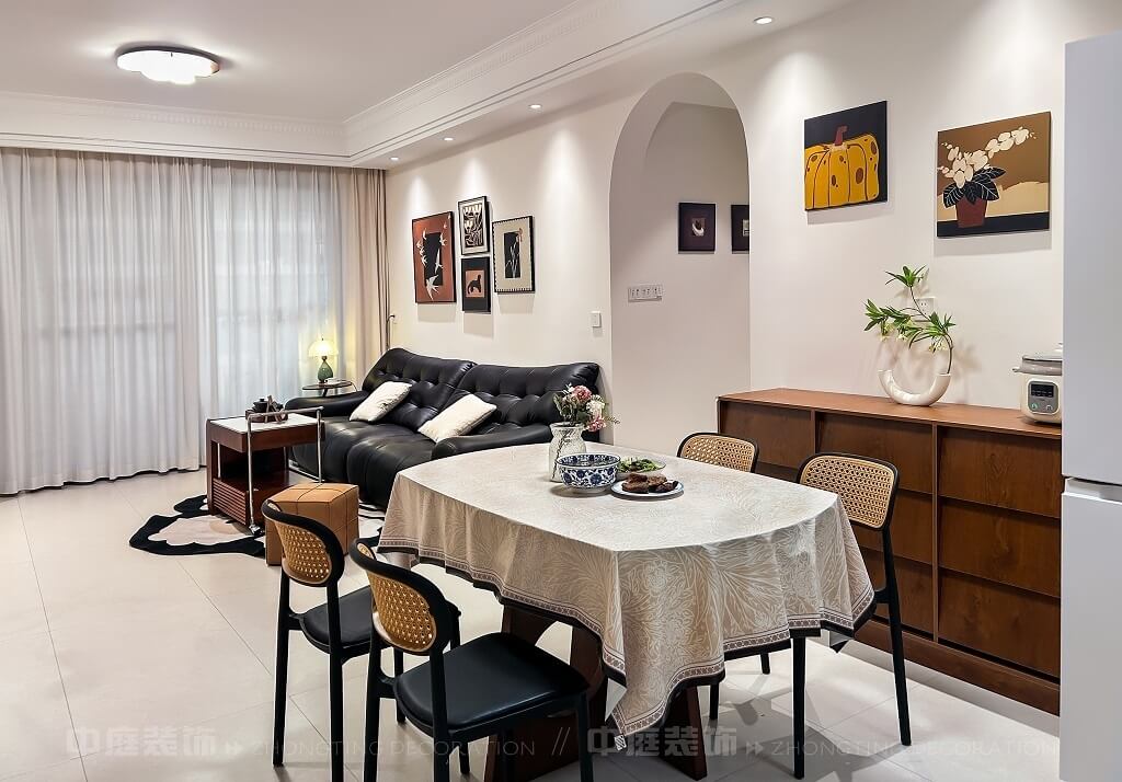 整體空間通過燈光設計、材質搭配(皮質、木質、藤編等),營造出舒適且富有格調的居住氛圍,細節處的裝飾畫、綠植、中國結等元素,提升了空間的藝術感與生活氣息。復古與現代碰撞的家,每一處都戳中審美點!