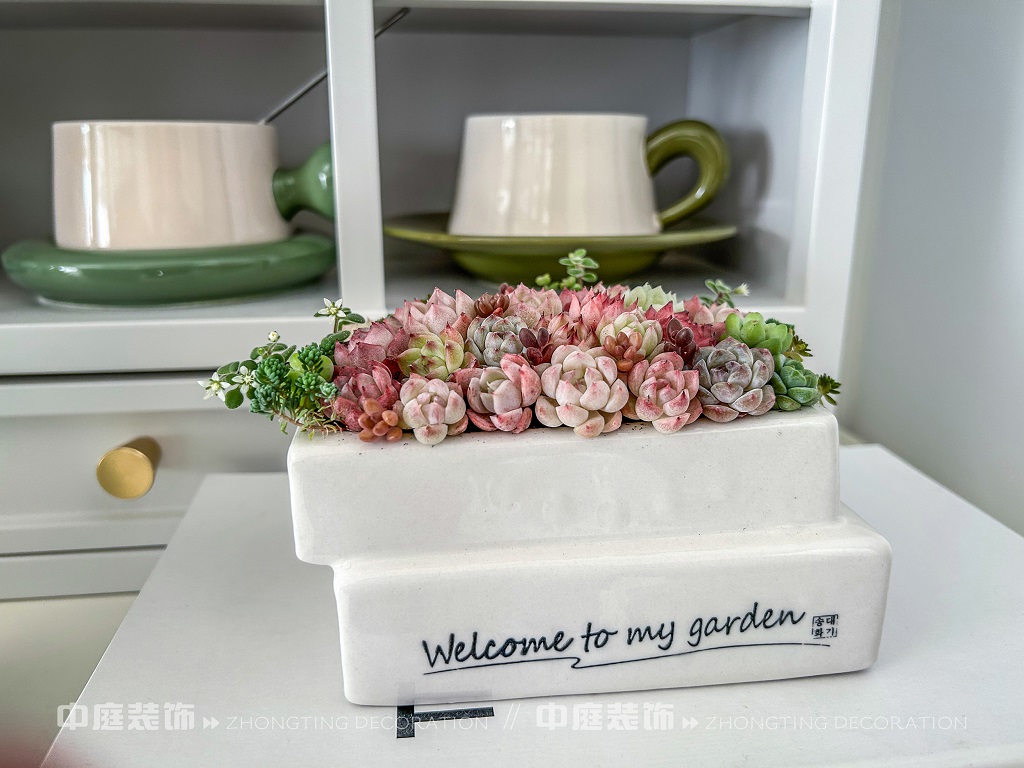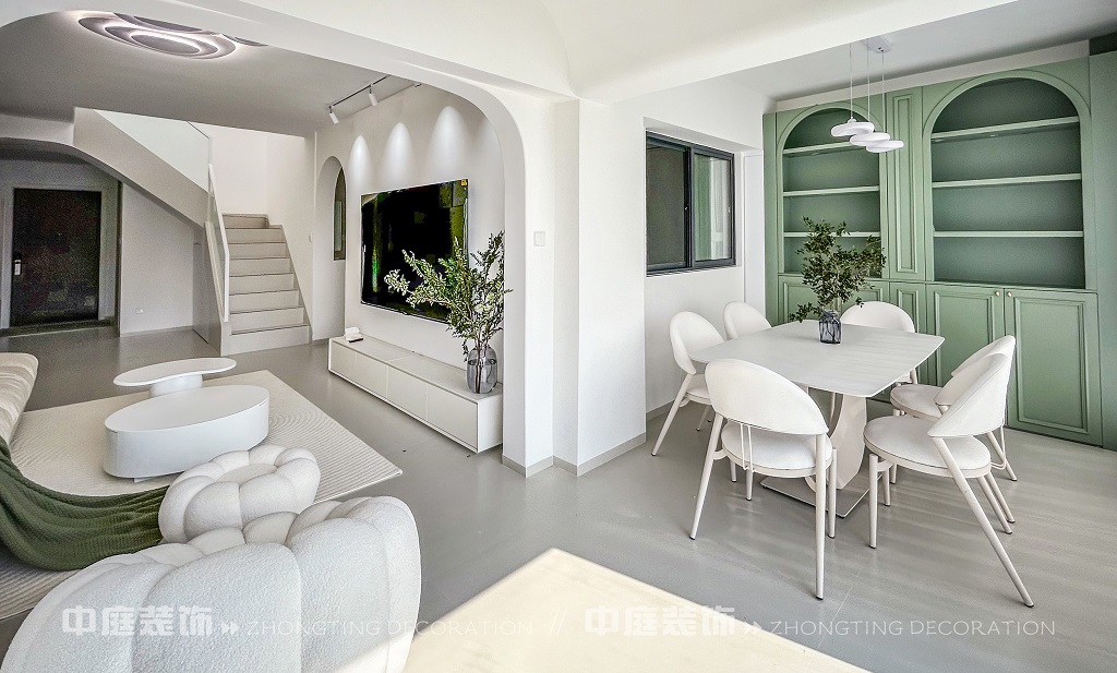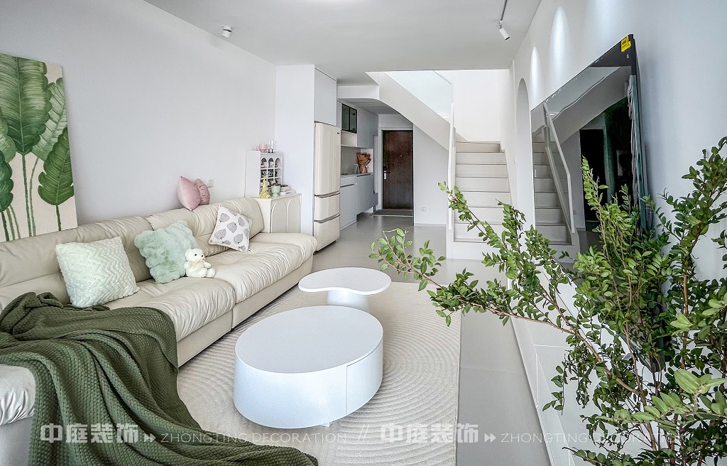 這一套綠意盎然的奶油風格好似把森林搬進了家,軟乎乎的奶白沙發搭配苔蘚綠毛毯,抱枕選了粉綠撞色,往上面一躺,一天的疲憊都被融化了!圓潤的白色組合茶幾,顏值與實用并存,氛圍感直接拉滿。墻面掛畫大葉綠植藝術畫,角落擺放鮮活綠植,將自然綠意融入空間。