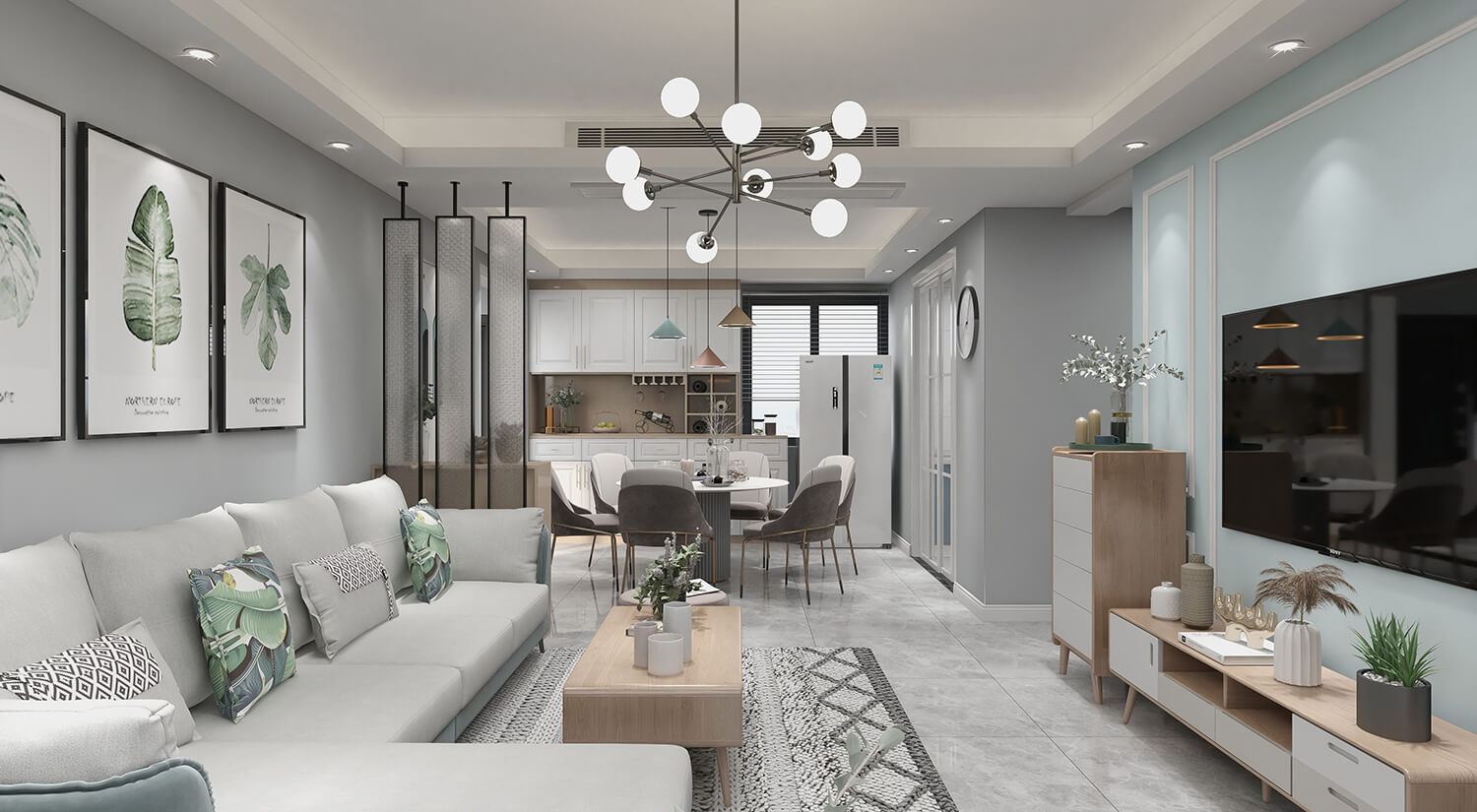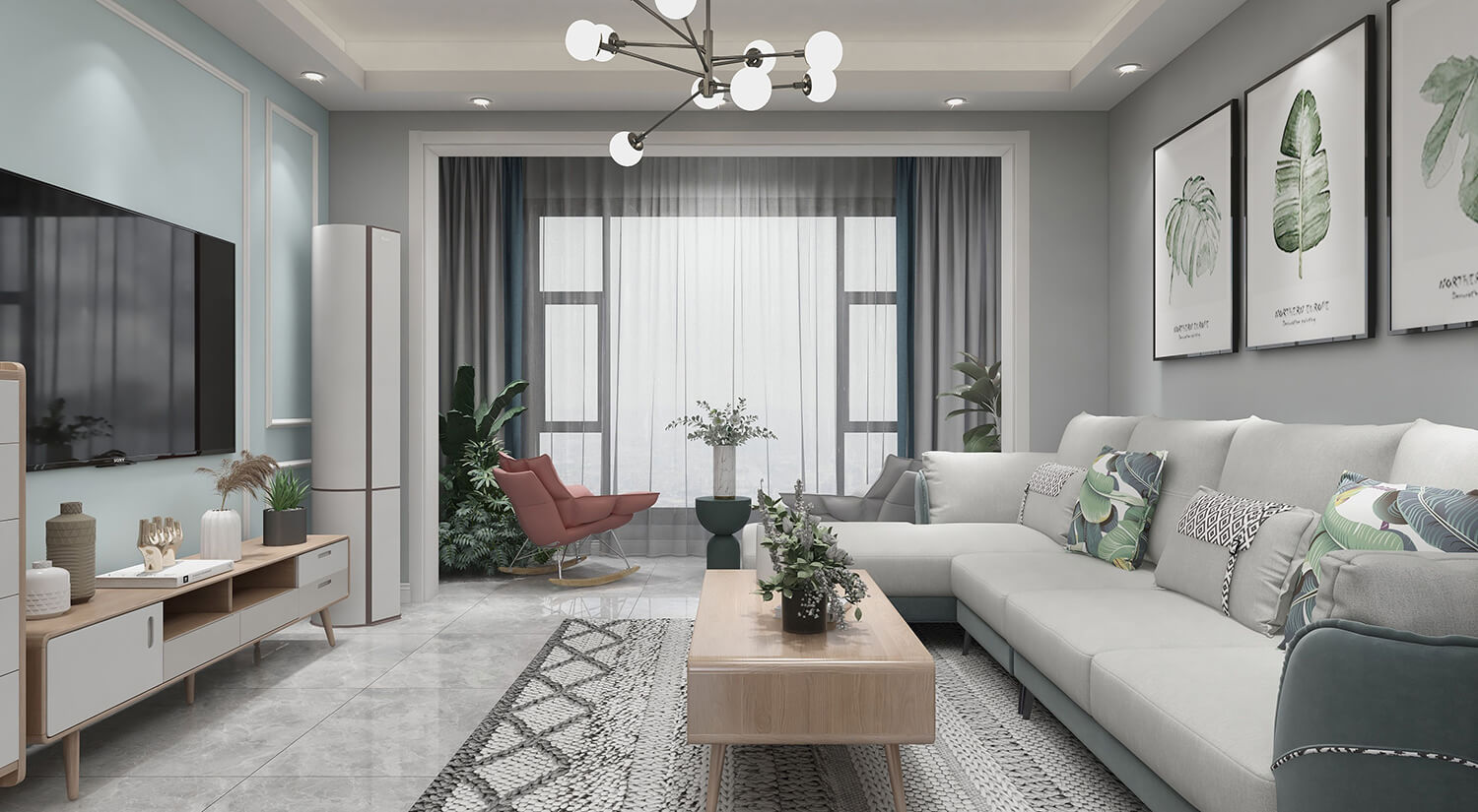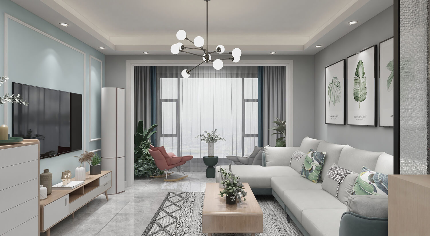 本案例戶型為:3房1廳1衛,總面積115㎡。這是一個北歐風格案例,北歐風格是一種追求簡潔、自然、舒適的室內設計風格。在新房的設計中,北歐風格常常采用白色、灰色和木色為主色調,配合簡潔的線條和自然材料,創造出清新、明亮的空間氛圍。