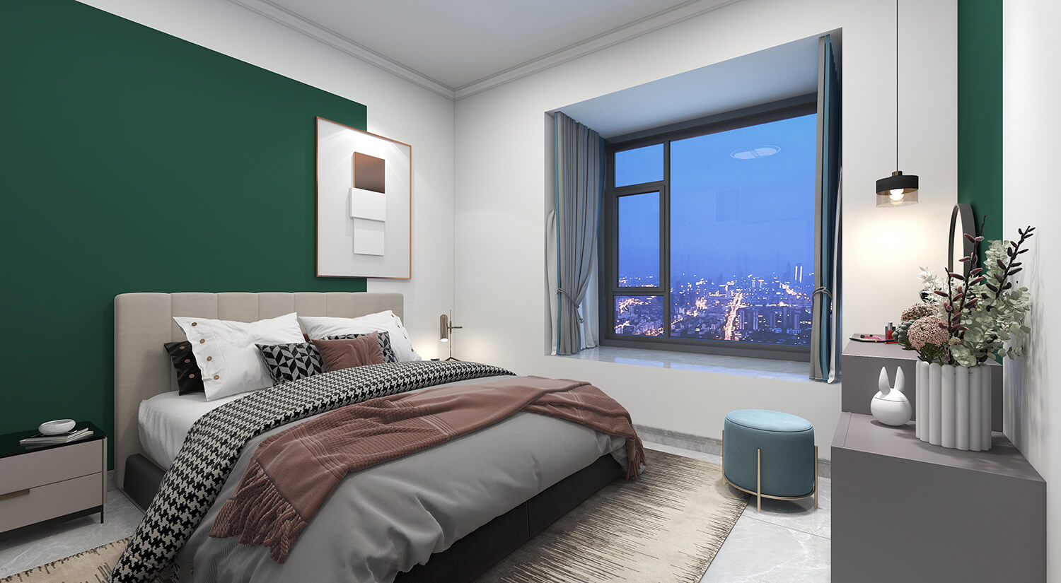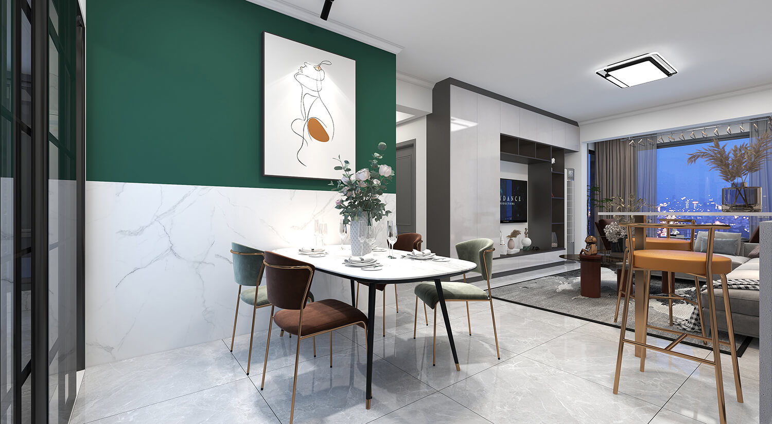 本案例戶型為:4房1廳2衛,總面積130㎡。墻壁、地板和天花板的顏色選擇明亮的白色,并搭配少量的深綠色作為點綴。在各種金屬質感家具元素的襯托下,整體現代感十足。