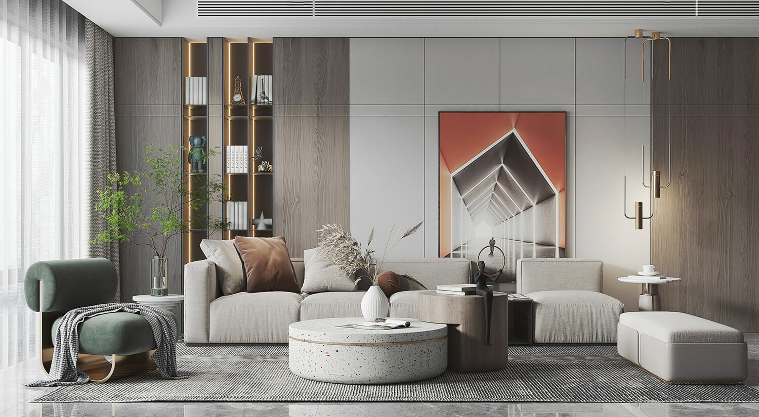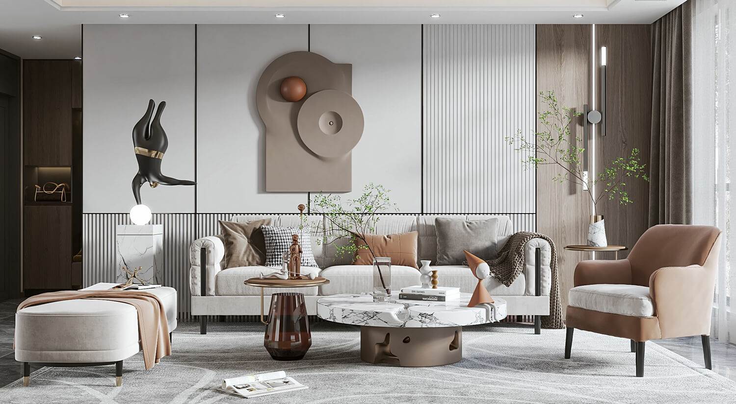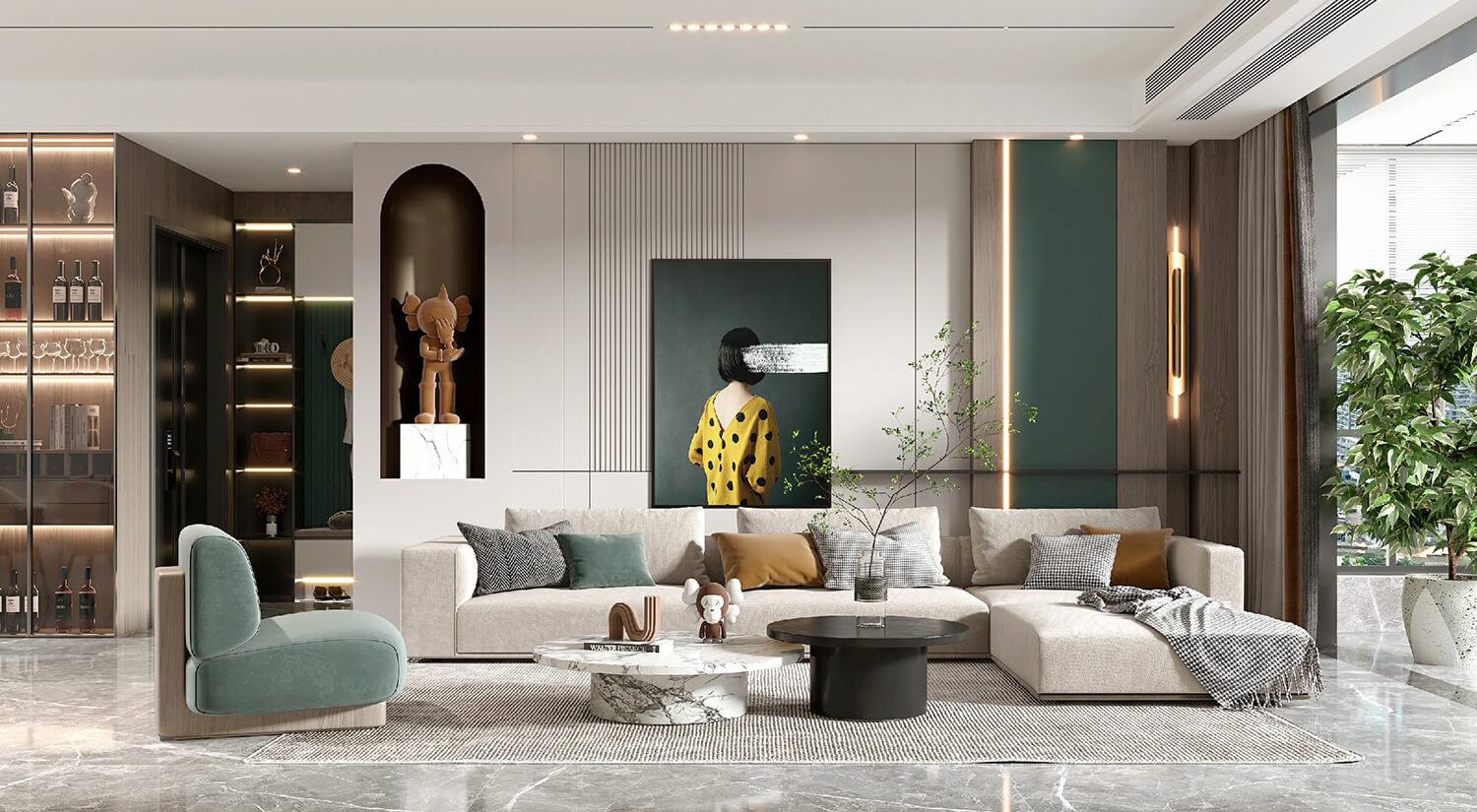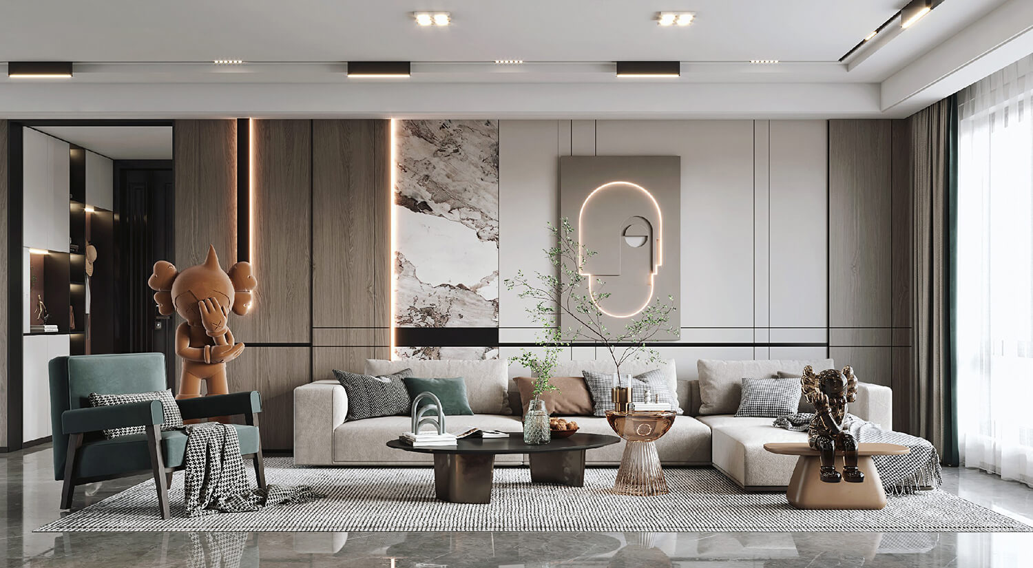 顏色搭配也是現代輕奢風格的重要部分。通常使用大面積的中性色調,如白色、灰色、米色等,這些顏色可以使空間更加明亮、舒適。同時,也會加入少量的金屬色調和珠光色,如金色、銀色、香檳色等,讓空間更具奢華感。