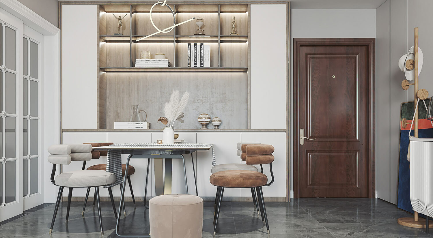 現代輕奢風格注重細節處理,如用金屬或水晶飾品點綴,營造出高貴典雅的氛圍。整體選用大面積的白色,再選用淺棕色的色調作為點綴,整體富有質感又有生活的溫馨。