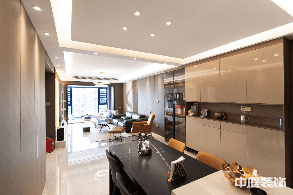 輕奢風格的空間以金屬、皮革的中性色調為主,用色彩的純度傳遞細膩的質感。