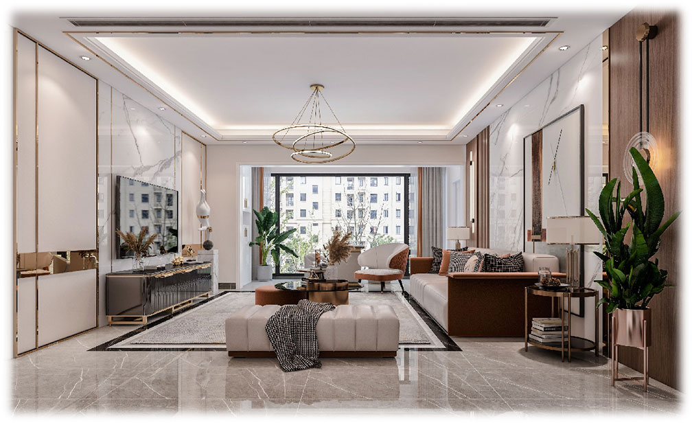 客廳用現代輕奢裝飾,象牙白與駝色加簡單的金屬線條裝飾讓客廳看起來更顯高級感,淡雅的顏色搭配干練的線條這巧妙的搭配讓空間在簡約的外表之下大大的豐富了空間的層次感,不動聲色的流露出靈魂中的優雅。