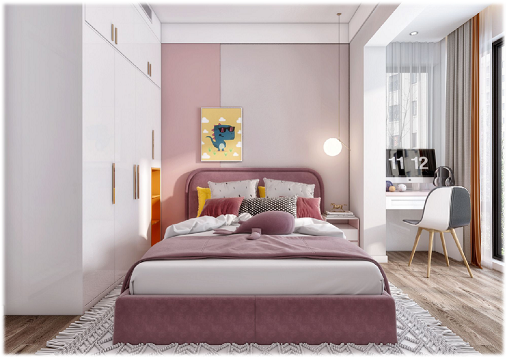 公主房主體以粉色輔以大面積留白,主體粉色吸引目光美麗溫馨,而充滿樂趣,大面積白色代表純潔,充分表現了少女的甜蜜純潔,在此之中輔以橙色在美麗中又不缺活潑,一點點灰色豐富整個畫面感帶有端莊,房間陽臺外擴,充分利用空間開闊明亮。