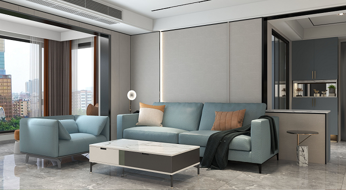 整個空間變得更加寬闊通透,視野也有一定的拓展,藍色系的空間在整個空間當中變得更加大氣,再加上灰綠色的布藝沙發,灰色的茶幾在色調上有的用的沖擊性豐富了整個空間當中的層次。