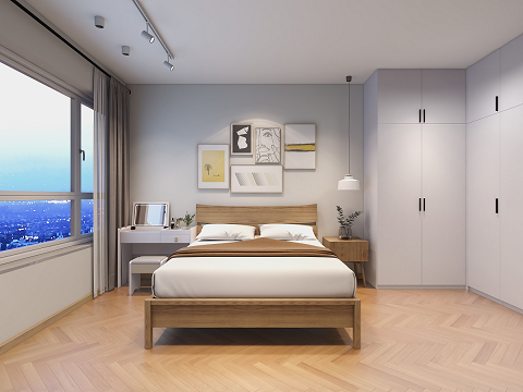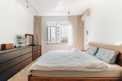 主臥整體用色與風格延續整體原木色系,木地板配木色家具,色調素雅,加上簡潔而現代的軟裝陳設,白色的棉麻窗簾讓室內的氣氛柔和而溫馨