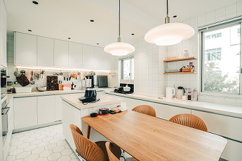 和諧統一的色彩與獨特的空間布局,塑造出干凈純粹,簡練又美的空間氛圍。再次然家里人都很喜歡烹飪,廚房是家庭的核心,經常做飯洗碗時都會有兩個人以上一起操作。這個方案很好的解決的業主的一系列需求